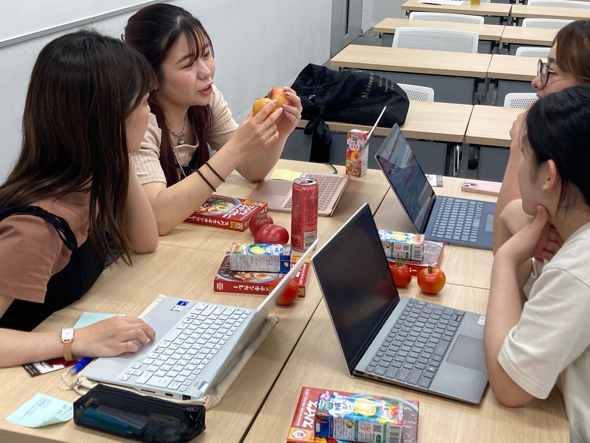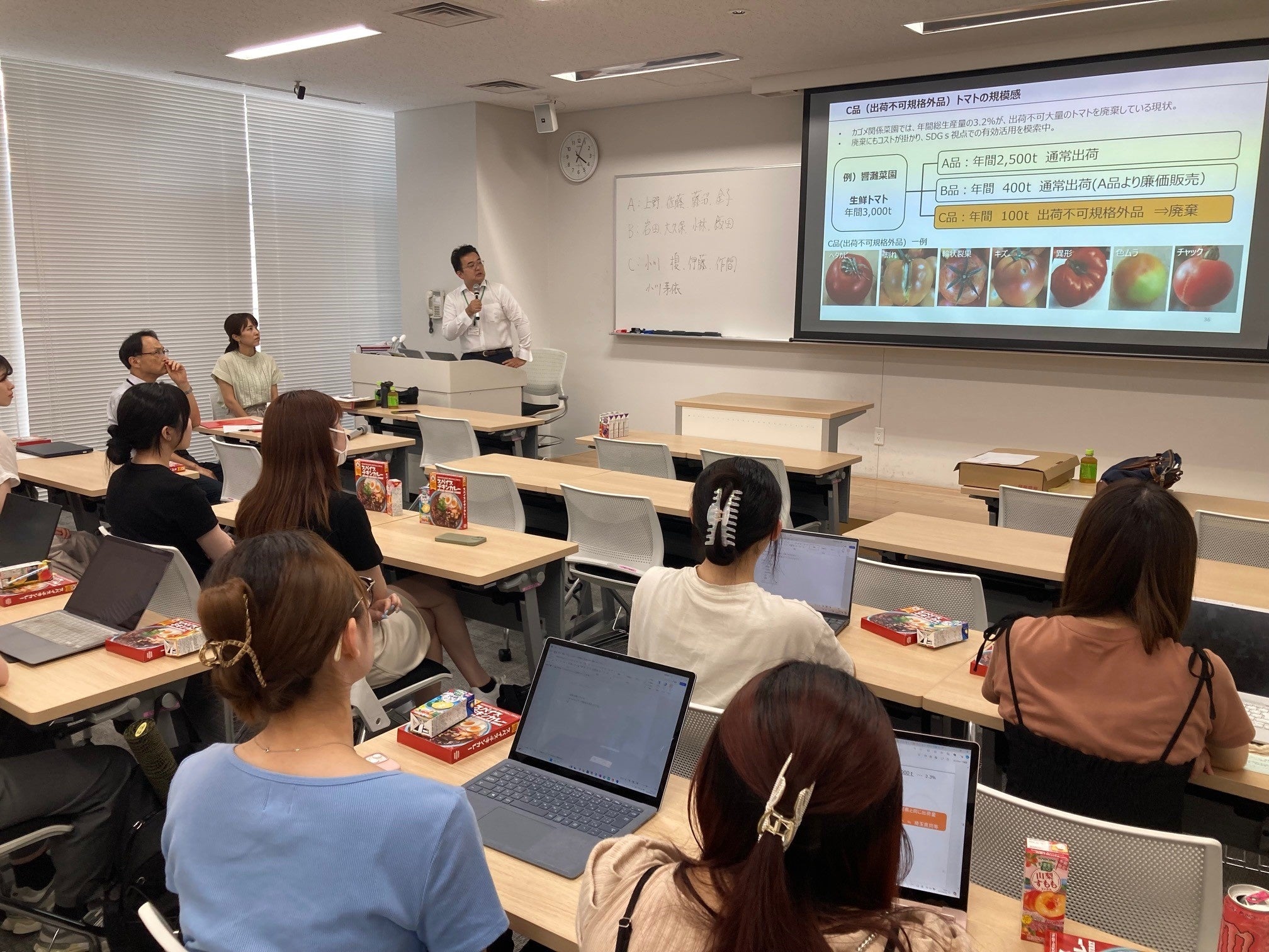 プロジェクト初日となる6月26日に行われたオリエンテーションでは、12名の学生が参加し、出荷規格外トマトの有効活用に関するアイデア出しを行いました。参加した学生は、「規格外トマトについて、実感を持って学ぶことができた。今日得た知識に加え、実際にトマト栽培の現場で農家の方に話しを聞くことで理解を深め、良い提案を考えたい。」と、語っていました。今後、トマトの栽培施設を見学し、サステナビリティ活動や生鮮トマトビジネスの第一線で活動するカゴメ従業員から収集した情報を元に、最終発表に向け、およそ7か月間にわたり学修します。産学連携による取組みを通じて、人材の育成と、社会課題である「食品ロス削減」に向けての意識醸成を図ります。