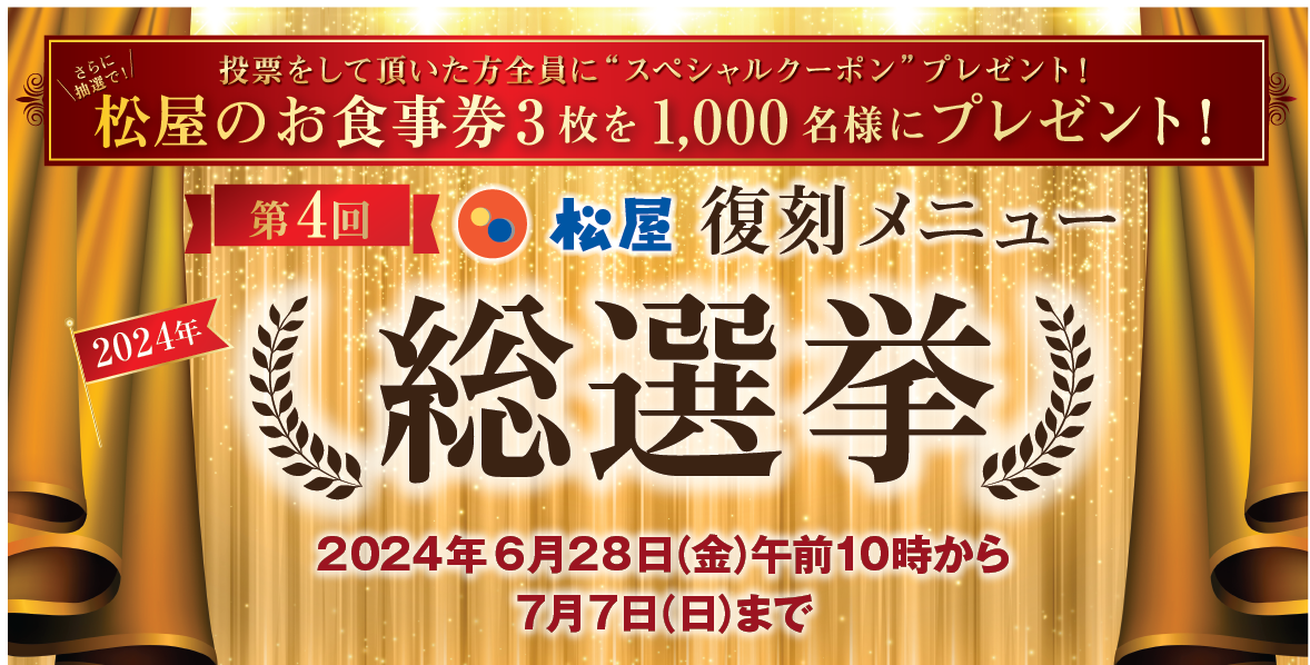 このたび松屋フーズ(本社:東京都武蔵野市、代表取締役社長:瓦葺一利)では、牛めし・カレー・定食・その他丼の「松屋」におきまして、2024年6月28日(金)から2024年7月7日(日)まで、「松屋復刻メニュー総選挙」を開催いたします。