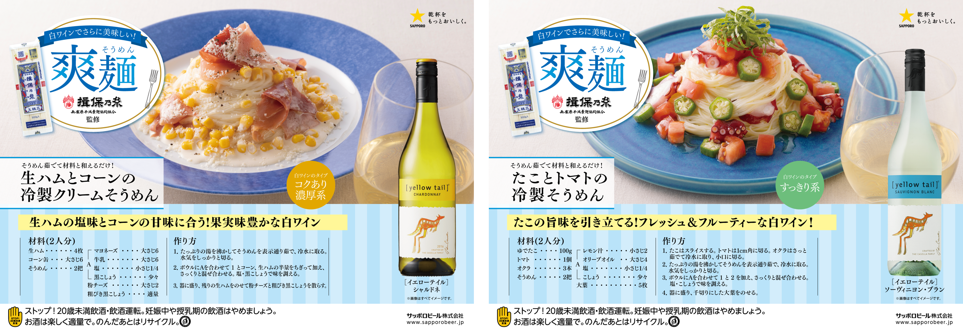 サッポロホールディングス(株)のグループ企業であるサッポロビール(株)は、販売する白ワイン[イエローテイル]、タリケ、パラ・ヒメネス、グランポレールなど、9種類の商品に合う、揖保乃糸監修アレンジレシピとコラボレーションした企画を提案します。