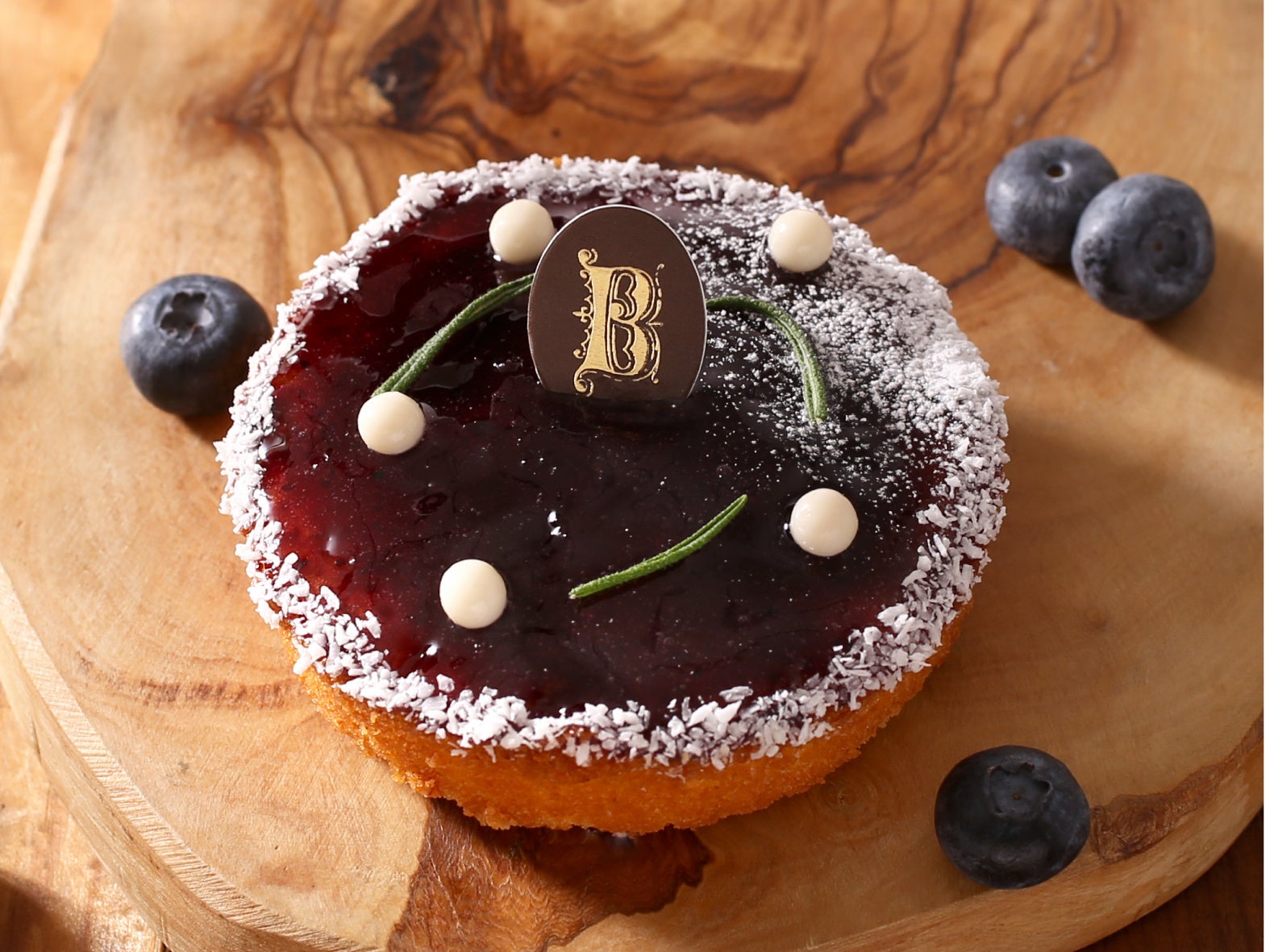 ブルーベリーの果肉を生地に焼き込みコンフィチュールを添えた、華やかな味わい。