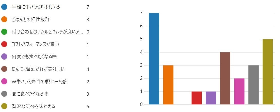 最も多くの票を集めたのは『手軽に牛ハラミを味わえる』というポイントでした。以下2位は『贅沢な気分を味わえる』、『にんにく醤油だれが美味しい』でした。