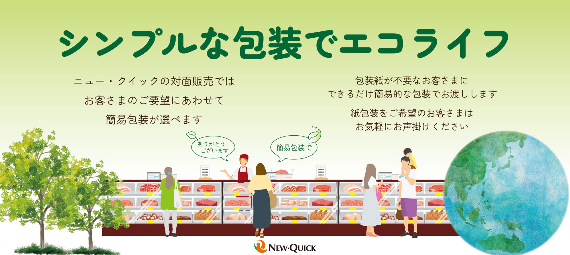 近年のお客様のごみ削減・環境意識の高まりを受け、ニュー・クイックでは6月より環境エコ活動推進の一環として、「シンプルな包装でエコライフ」をテーマに、対面販売における簡易包装(包装紙を使用しない)活動を行っております。