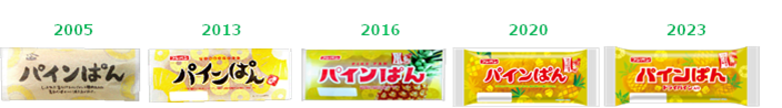 発売当初より夏らしい爽やかなパッケージをデザイン。毎年大きくデザインは変えず、書体や色味などを合わせることでお客様に「今年もパインぱんの季節が来た」と思っていただけるよう心掛けております。
