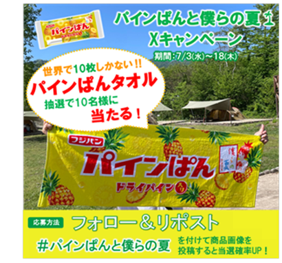 応募条件:フジパン公式Xアカウントをフォロー&リポスト「#パインぱんと僕らの夏」を付けて商品画像を投稿すると当選確率アップ。抽選で10名様に「オリジナルパインぱんタオル」をプレゼント いたします。