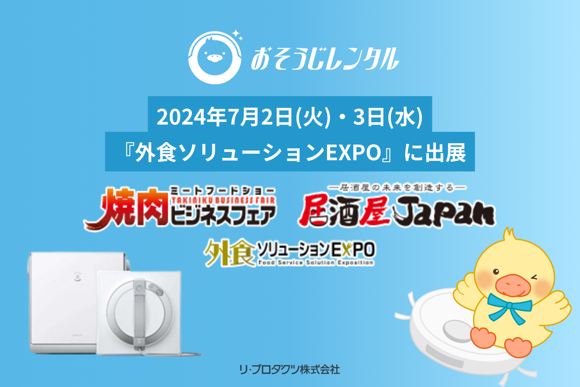 外食ソリューションEXPOは、幅広い外食・飲食業界の関係者が参加する年に1度の専門展示会です。各分野の垣根を超えた課題解決や新たな発見の場として活用されてきました。リ・プロダクツは、清掃資材の販売・製造および清掃サービスを提供し、法人の清掃DXを推進する企業です。今回のEXPOでは、飲食店運営の関係者さまに有効な清掃資材やフロアコーティングサービス「Reエコ・コート」、掃除ロボットレンタルサービス「おそうじレンタル」などを中心にご紹介いたします。