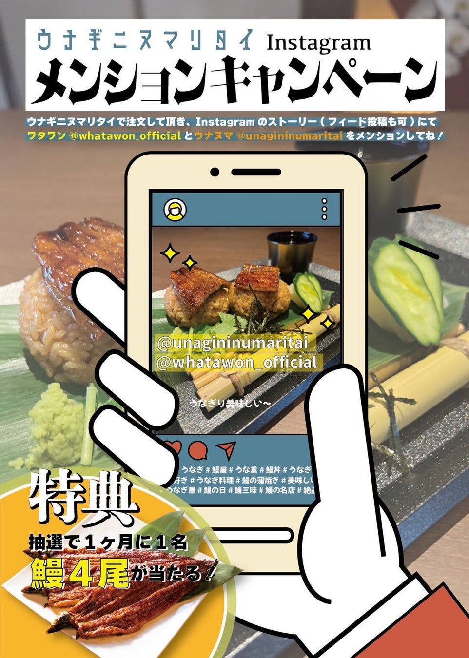 ウナギニヌマリタイで注文して頂き、Instagramのストーリー(フィード投稿も可)にて