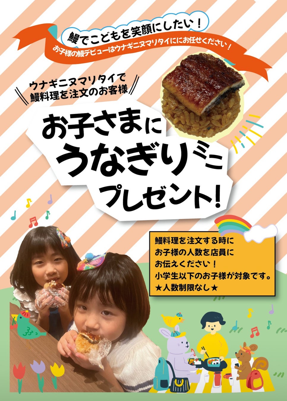 ウナギニヌマリタイで料理を注文頂いたお客様のお子様全員に、もれなく「うなぎり(鰻のおにぎり)」ミニサイズをプレゼントします。
