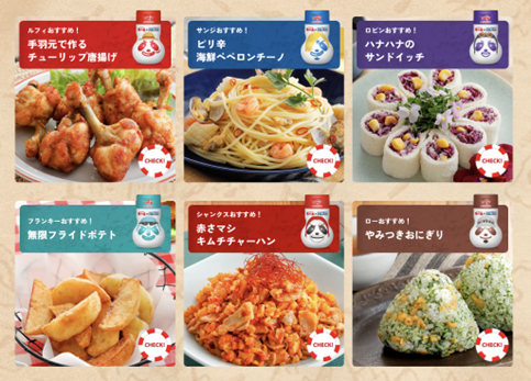 「味の素®」を使ったルフィたちの好物のレシピを「冒険レシピ」として特設ページ(https://www.ajinomoto.co.jp/aji/umami_onepiece/)で公開中。「ルフィおすすめ!手羽元で作るチューリップ唐揚げ」や「サンジおすすめ!ピリ辛海鮮ペペロンチーノ」など6種のコラボレシピを紹介しています。