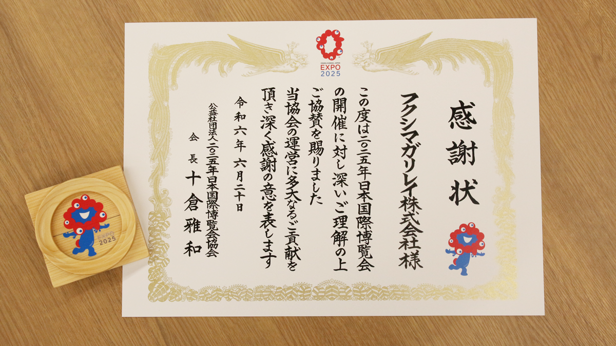 フクシマガリレイ株式会社(本社:大阪市西淀川区、代表取締役 社長執行役員 福島 豪)は、2024年6月20日に公益社団法人2025年日本国際博覧会協会より、感謝状を受領しました。この感謝状は、博覧会協会が大阪・関西万博に出展・協賛している企業・団体に幅広く感謝の意を伝えるために贈呈しているものです。