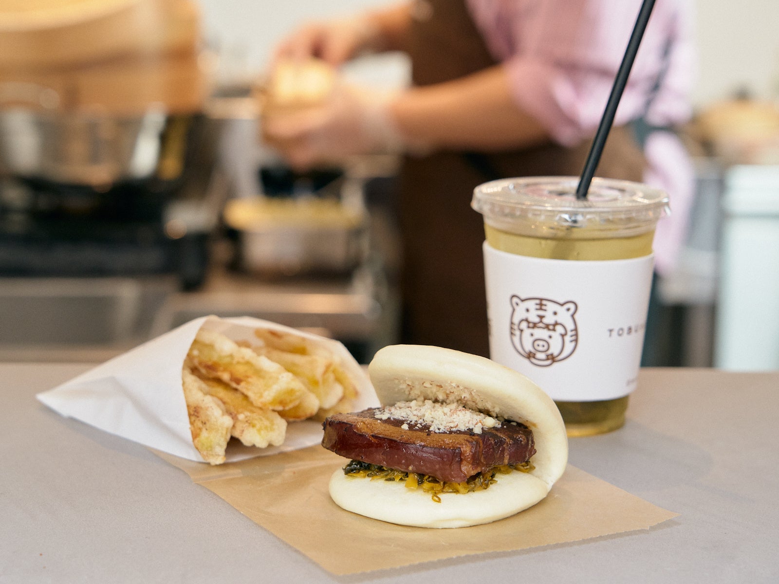 店名は台湾の刈包(台湾バーガー)の別名「⻁咬豬」に由来。「とぶ」は台湾人の努力と上り坂で飛躍するイメージを、「ぶ」は豚肉の旨味という意味も含んでいます。