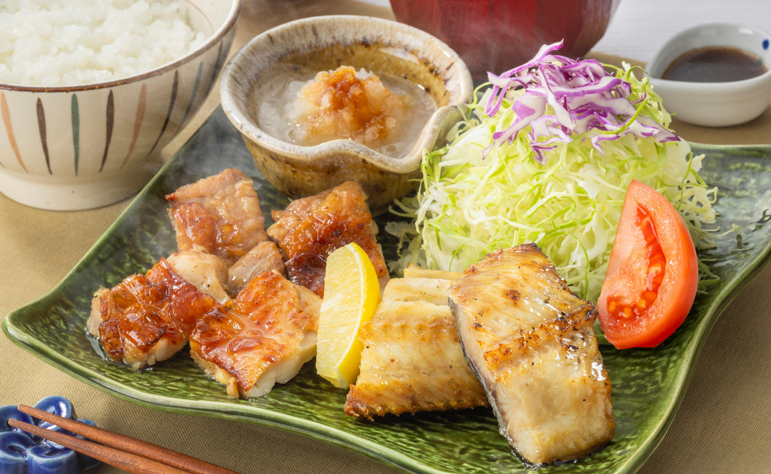 炭火でふっくら焼き上げた肉厚のしまほっけと、外はパリッと、中はしっとりとした食感が楽しめ、香ばしさともろみの旨みが口の中に広がる“もろみチキン”の合い盛り定食。焦げ目が食欲をそそる大満足の逸品です。