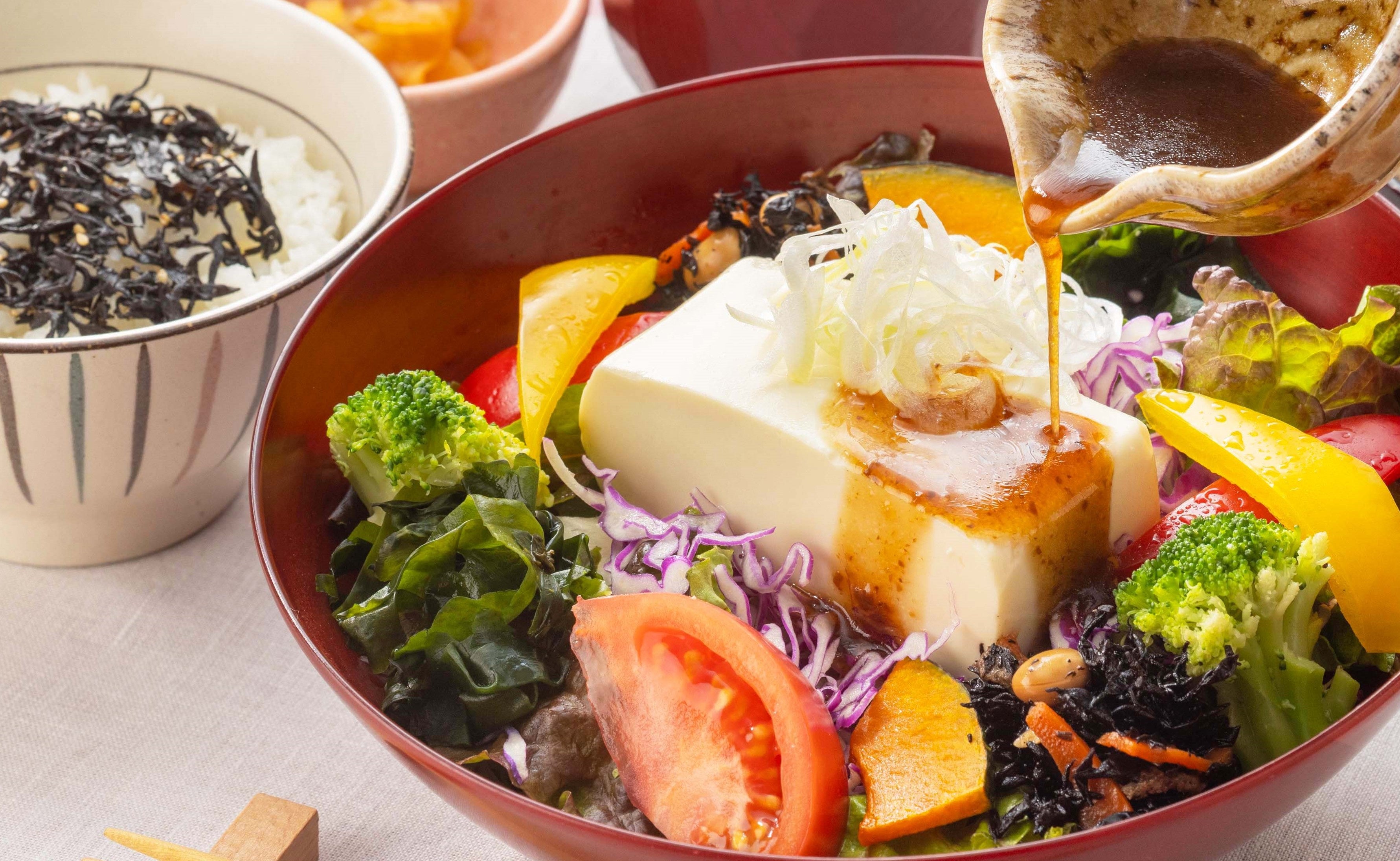 たっぷりの彩り野菜に豆腐と海藻を合わせた、さっぱりと食べられるヘルシーメニュー。大戸屋こだわりの「鰹本枯節」をかければ、削りたての芳醇な香りと味わいも楽しめます。健康志向の⼈やダイエット中の方にもオススメです。