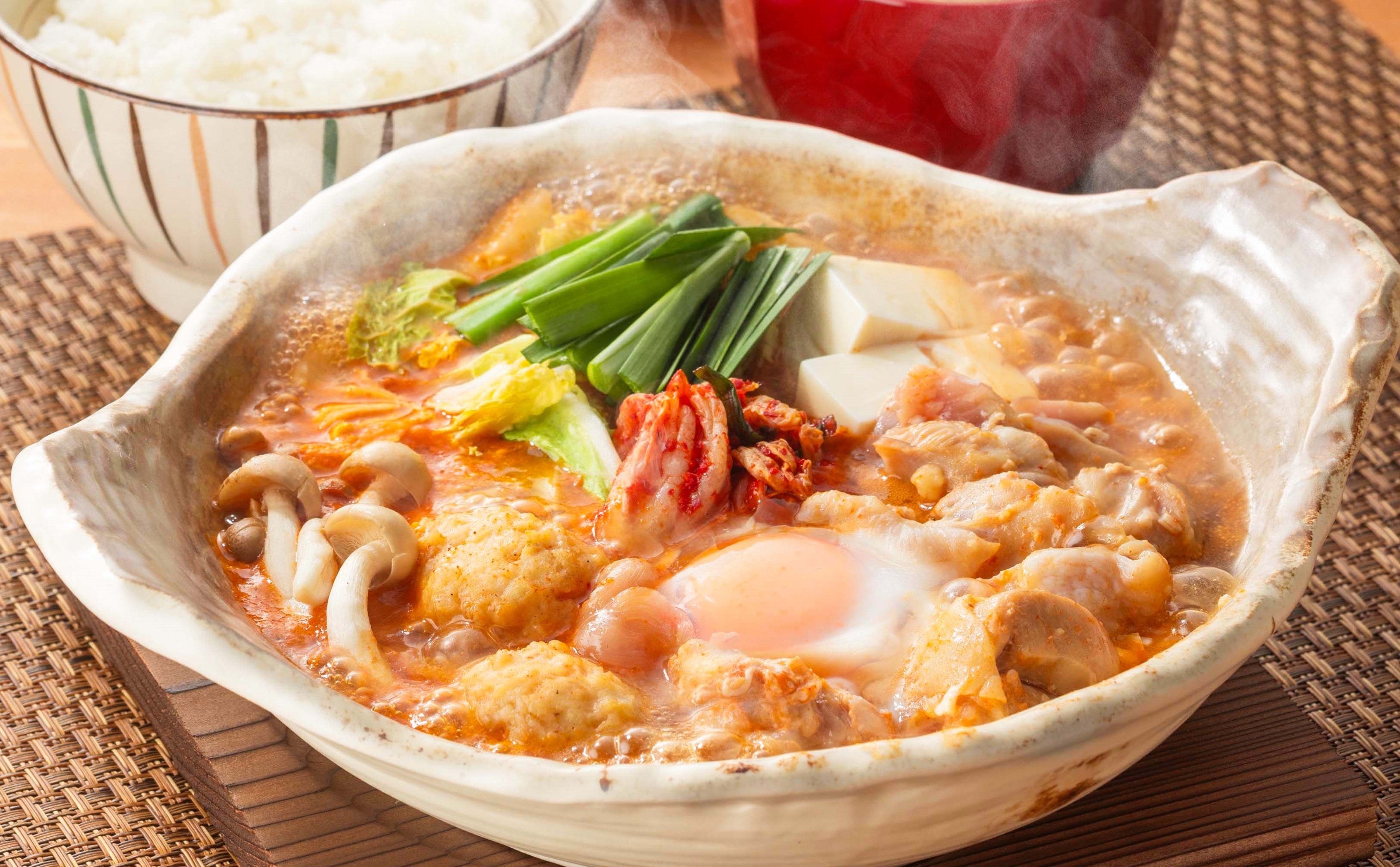 塩麹にしっかり漬けた鶏肉と、鶏つくね、白菜、しめじ、ニラ、豆腐を使用した、野菜たっぷりのキムチチゲ。マイルドな辛さの絶品スープがまろやかな鶏もも肉の旨みを引き立てます。心も体も温まる贅沢な鍋メニューです。