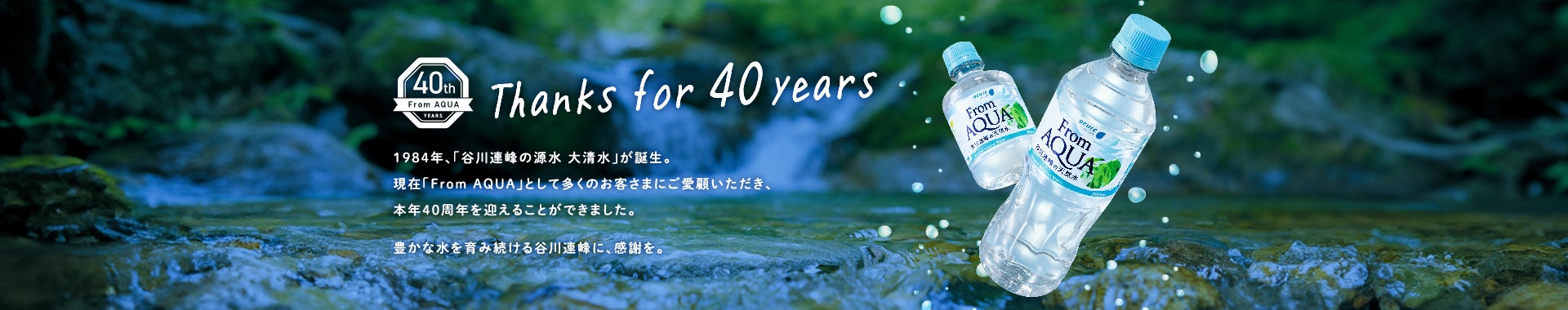 「From AQUA谷川連峰の天然水」は、前身の「大清水」として発売して以降、多くのお客さまにご愛飲いただき、今年で発売40周年を迎えることができました。いつもありがとうございます。