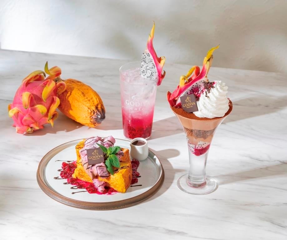 7月から新登場するメニューは、チョコレートと旬のドラゴンフルーツを使用したデザート「フレンチトースト ドラゴンフルーツ&ココナッツ」、「ドラゴンフルーツとココナッツのチョコレートパフェ」と、ドリンク「ドラゴンフルーツのレモネードソーダ」、そして桃を使用したドリンク「桃とアールグレイのクリームソーダ」の全4種類です。さらに、「アフタヌーンティーセット」は、カカオとチョコレートの魅力を存分にご堪能いただける内容となっております。