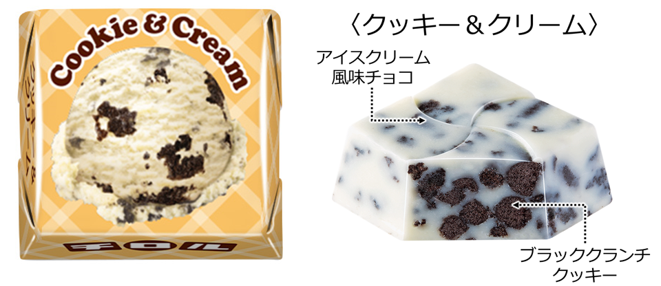 バニラ感のあるアイスクリーム風味チョコにブラッククランチクッキーを合わせた食べ応えのある一粒。