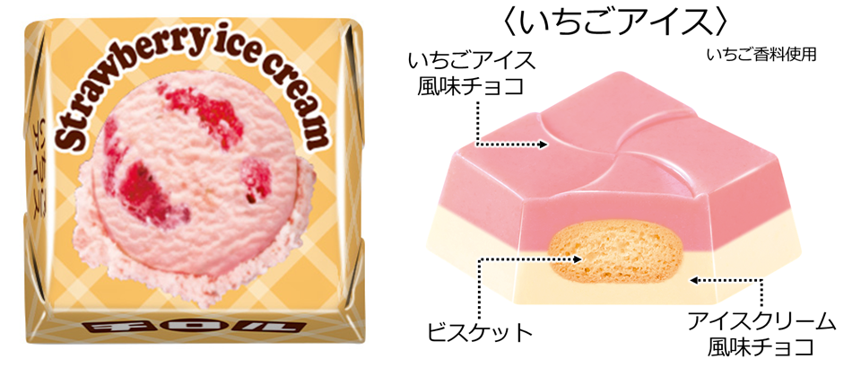 いちごアイス風味チョコにバニラ感があるアイスクリーム風味チョコを合わせました。