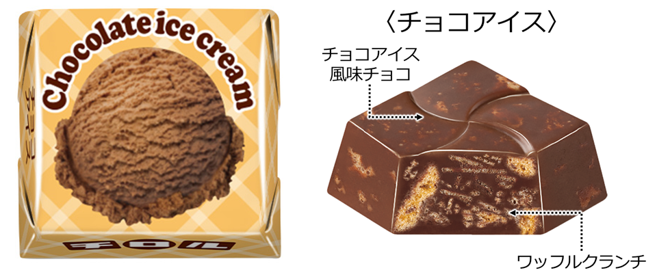 ミルク感のあるチョコアイス風味チョコと、コーンを表現したザクザクなワッフルクランチを組み合わせました。
