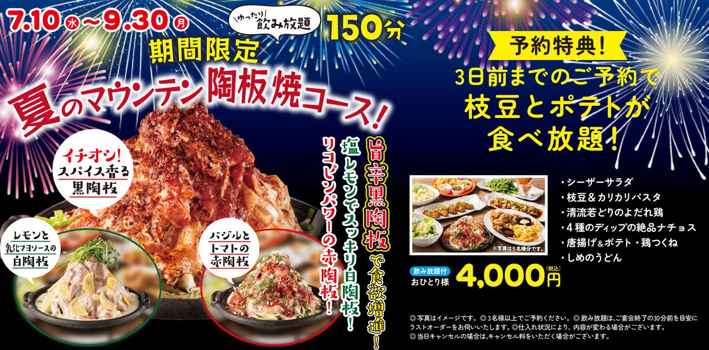 夏のマウンテン陶板焼きコース(150分飲み放題付き)税込4000円