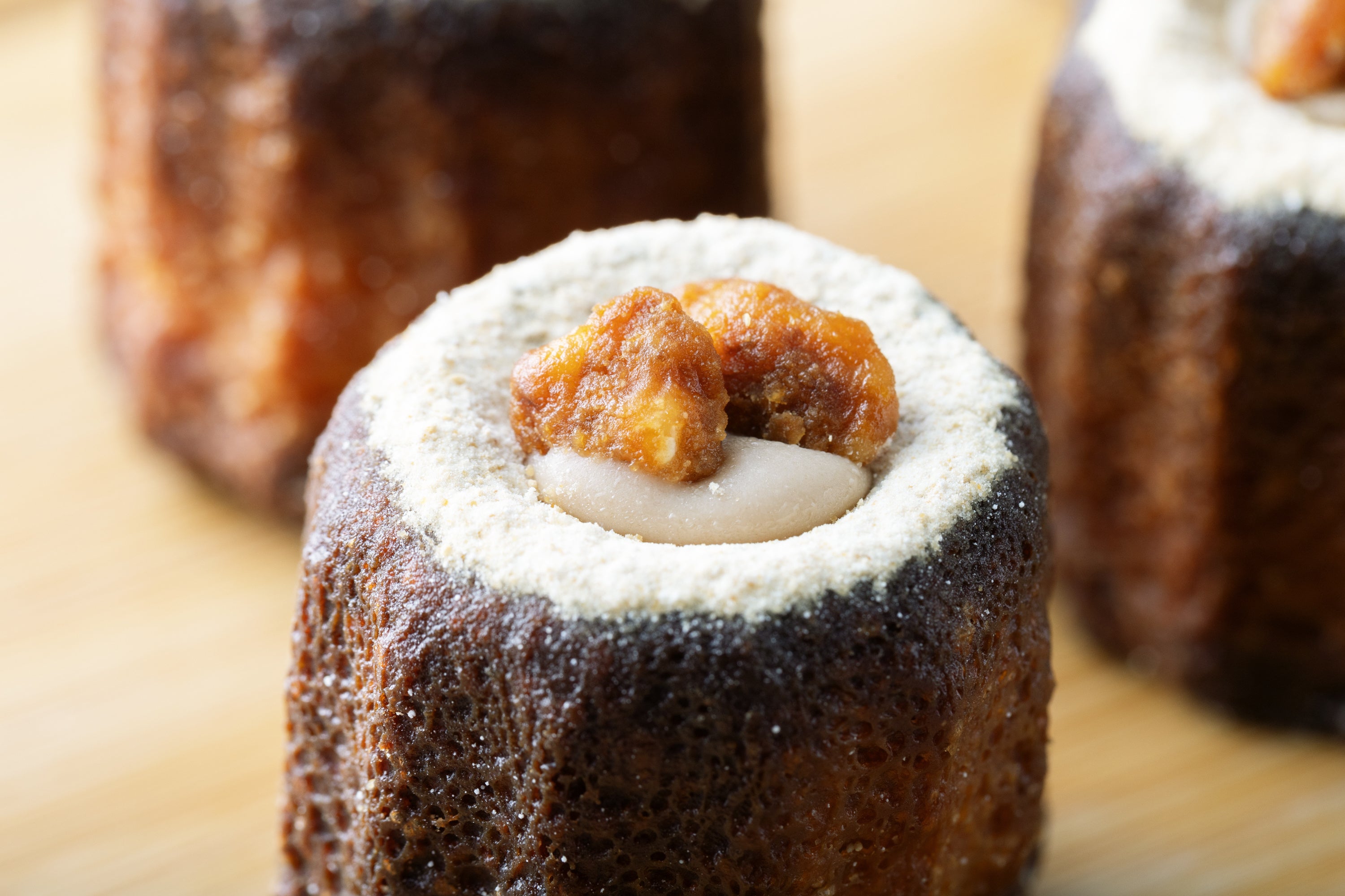 天面には黒糖に絡めたクルミをトッピング。クルミの食感と黒糖のカラメルのような甘さが、きな粉の優しい甘さのカヌレと絶妙にマッチします。