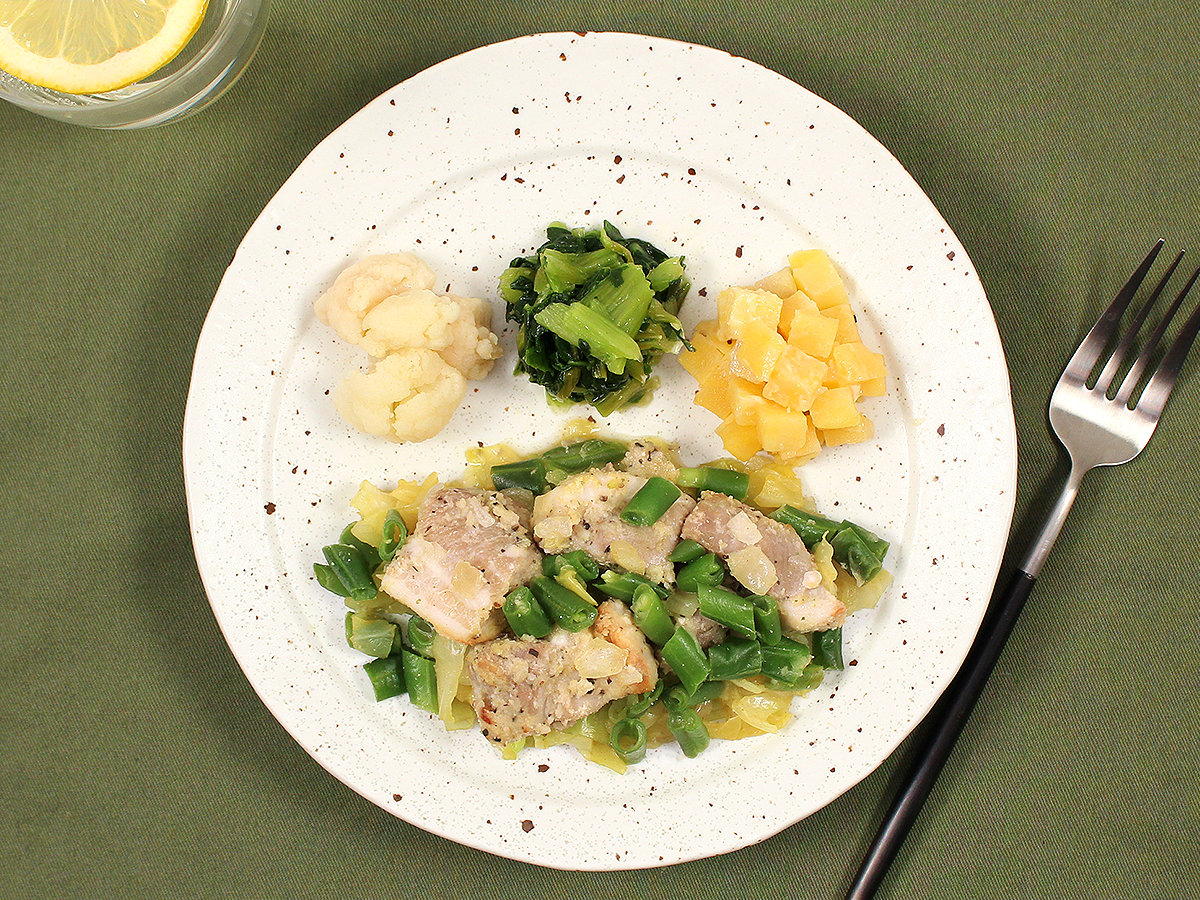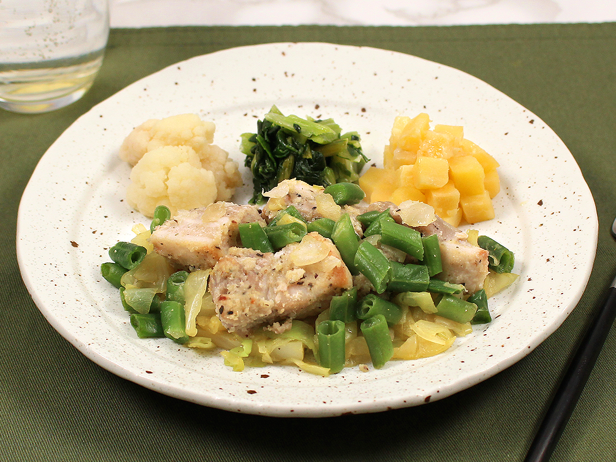 食べ応えのある厚切りの豚肉をバジルやオレガノなど6種のハーブで焼き上げ、軽やかな味わいに仕上げました!豚肉の旨みとハーブの香りが絶妙に調和し、野菜が美味しく食べられるプレートとなっております!