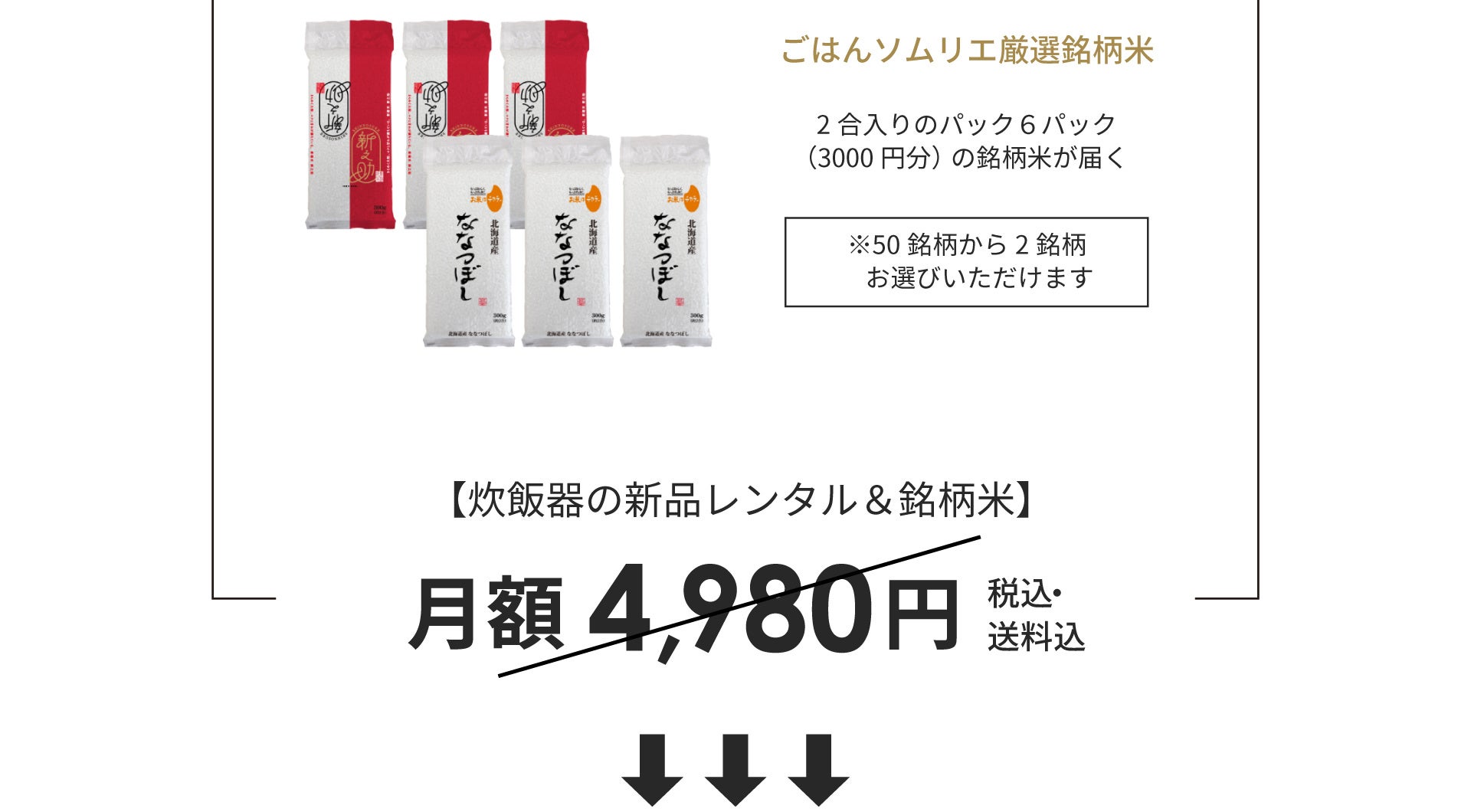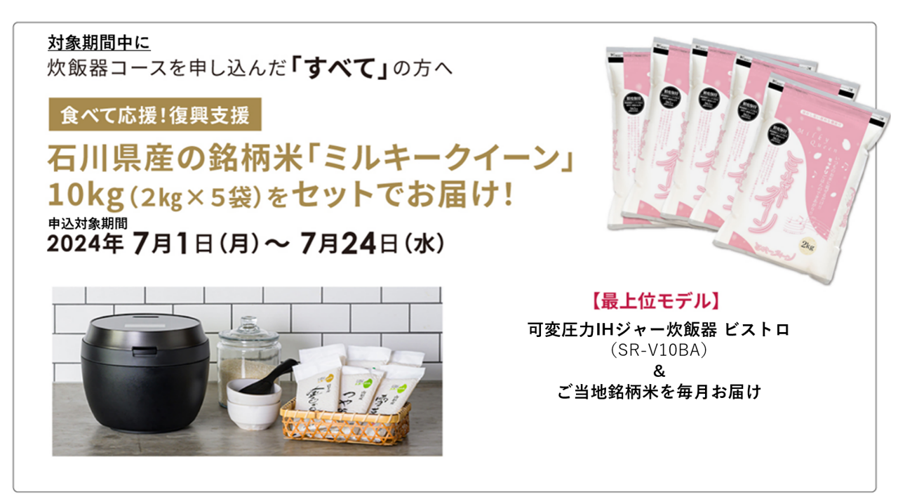 通常コースでは、新品の可変圧力IHジャー炊飯器 ビストロ(SR-V10BA)&ご当地銘柄米12合を毎月お届けしています。今回、期間限定で食べて復興応援!石川県産米のミルキークイーンを10㎏をセットでお届けします。さらに、foodable3周年感謝キャンペーン中のため、初月月額890円(送料込み・税込み)でご利用いただけます。