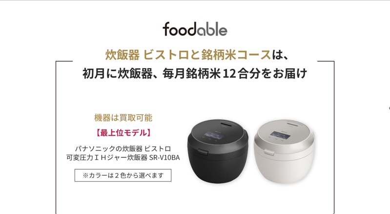 パナソニック株式会社(以下、パナソニック)は、家電と食のサブスクサービス「foodable(フーダブル)」にて、食べて応援!石川県産ミルキークイーン10㎏(2㎏入り5袋)がついた炊飯器 ビストロと銘柄米コースを販売いたします。
