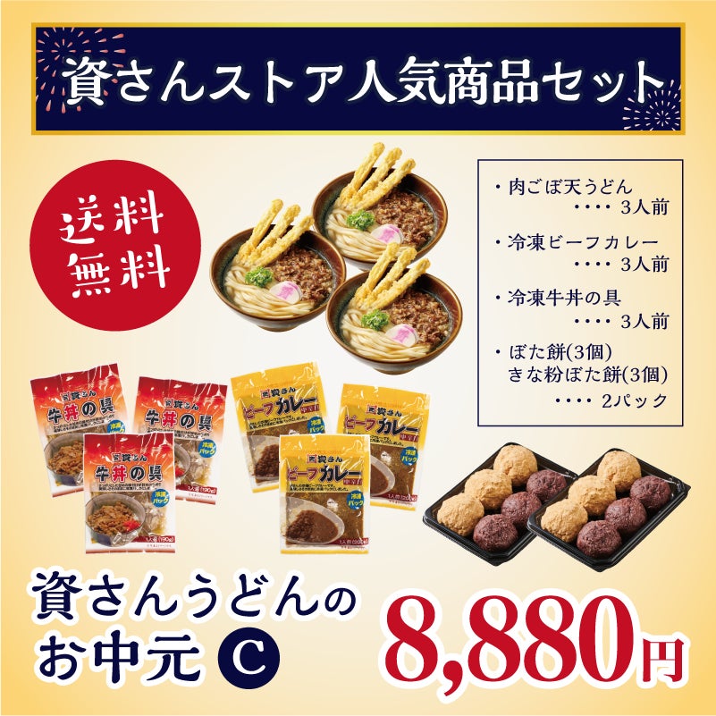 資さんストアの人気商品をぎゅぎゅっと詰め合わせたおすすめのセット。「肉ごぼ天うどん」、「ぼた餅」に加え、「牛丼の具」、「カレー」をラインナップ。温めるだけでお店の味を再現できる、とご好評をいただいています。「うどん」も「丼」も「ぼた餅」も!「資さんうどん」を再現したかの様な、特別なセットをどうぞ!
