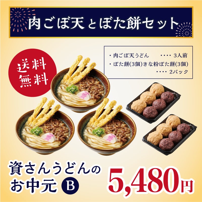「肉ごぼ天うどん」を三人前に、年間540万個以上を売り上げる「資さんうどん」名物、「ぼた餅」をセットにしました。「きな粉ぼた餅」は、通販限定での販売となりますので、いつもお店で「資さん」を召し上がっていただいている方にも、きっと喜んでいただけること、間違いなし。