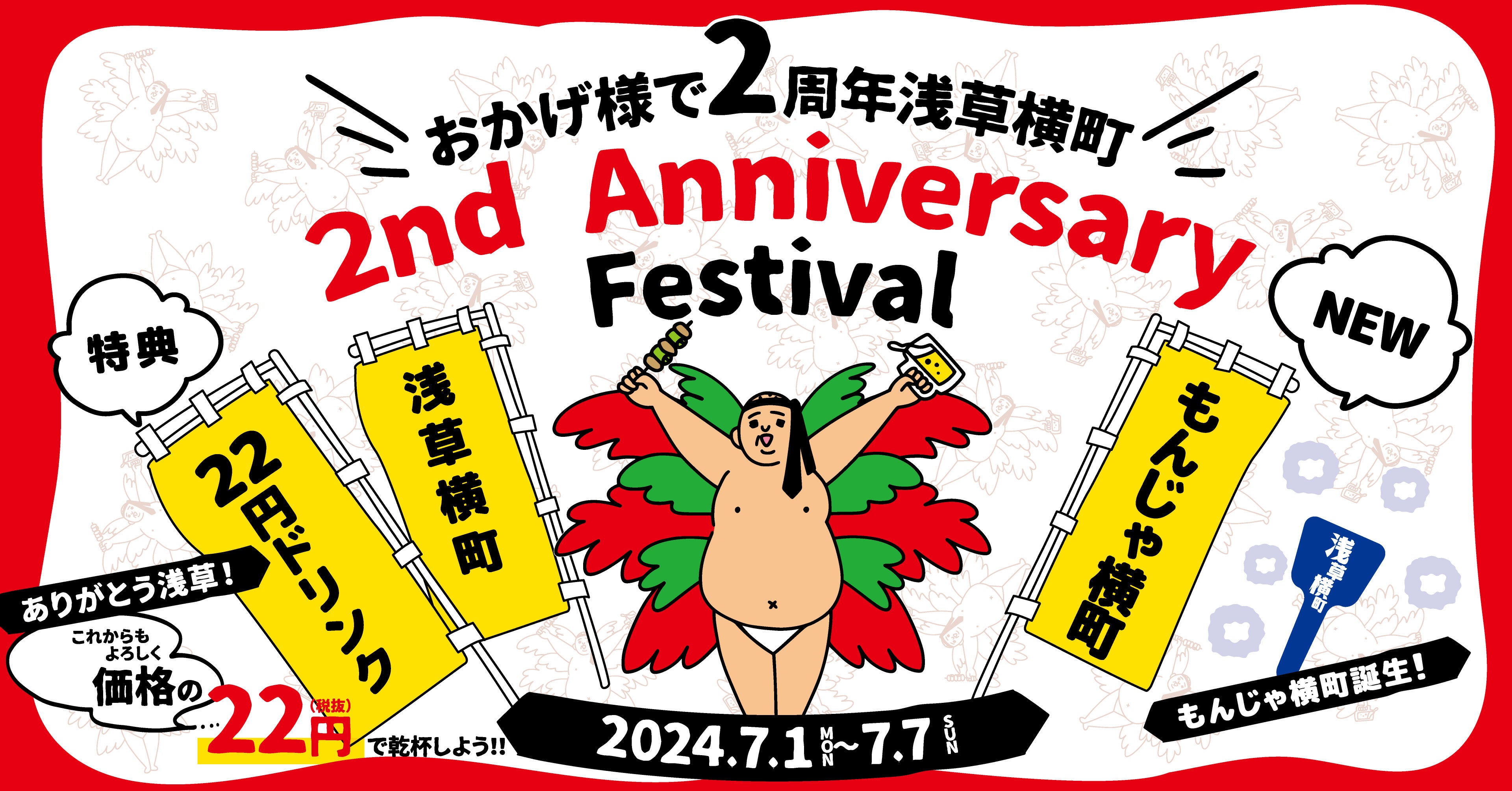 浅草横町は2周年を迎え、”祭り”から次のフェーズとして「もんじゃ横町」のコンテンツを増やしスタートします!これからもよろしく!の感謝の気持ちを込めて7月1日~7日はドリンク22円で乾杯しましょう!