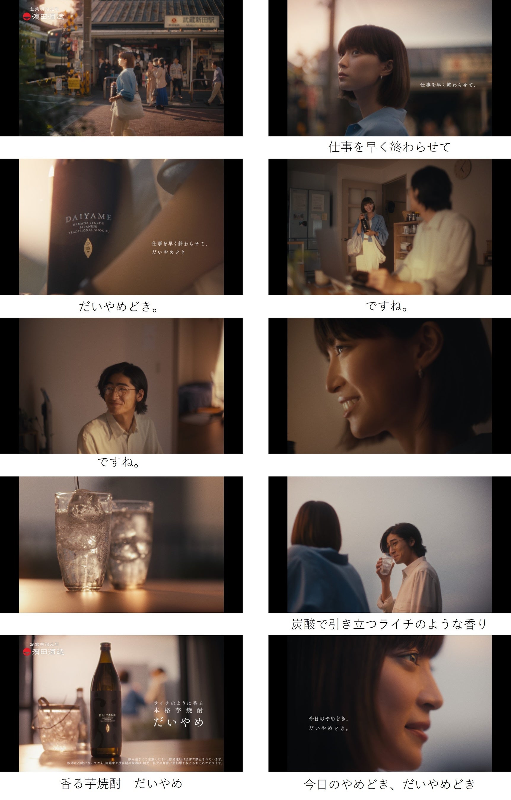 「だいやめ」とは、『晩酌して疲れを癒す』という意味を表す鹿児島の方言。家族や友人と晩酌しながら、一日を無事に過ごせたことに感謝し、リフレッシュして明日を迎える伝統的な食習慣です。2020年のコロナ禍以降、社会活動は制限されたことが多い一方、SNSやWEBチャット、オンラインゲームによる新しいコミュニケーションや出会いが生まれています。いつでもどこでも、だれとでも繋がれる世界。ですが、このような時代だからこそ、あえて世界を限定して表現してもよいのではと、夫婦の穏やかな癒しの時間を描いた2022年のCM第一弾「今日のやめどき、だいやめどき」篇をアップデート。新しく製作したオリジナル楽曲とともに、身近な「あの人」とのだいやめどきに浸る、満喫する男女二人の様子をドラマ風に描きます。