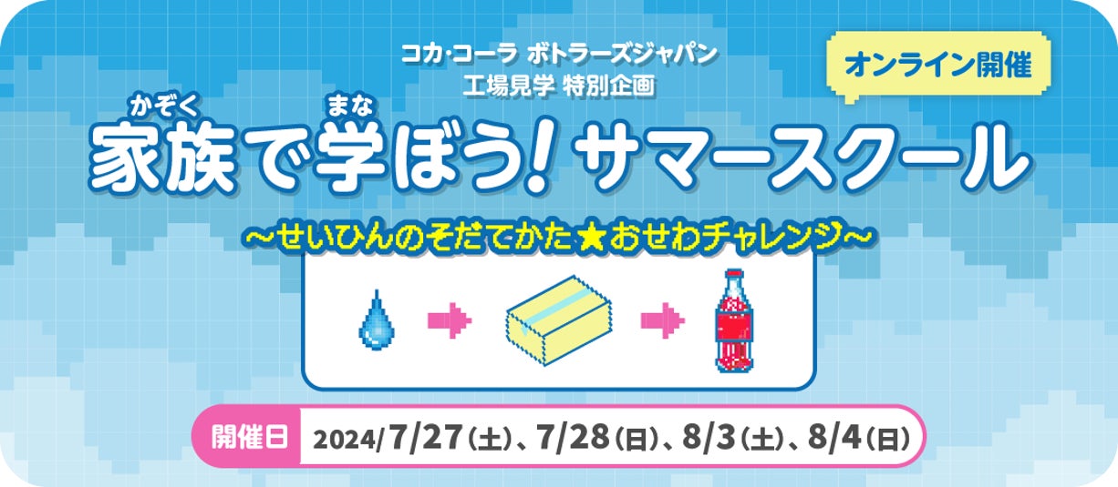 「家族で学ぼう!サマースクール」は、夏休み期間中に開催し、ご家族のみなさまで楽しみながら学んでいただくことを目的とした工場見学特別企画です。通常の工場見学プログラムにはない内容を提供します。本年のサマースクールのテーマは、「せいひんのそだてかた☆おせわチャレンジ」。森で育まれた水がPETボトル製品となり、お客さまのもとに届き、その後リサイクルされるまでの過程を、約60分の育成シミュレーション風のストーリーでご紹介します。製品の原材料である「水」がリサイクルされるまでの様子を、参加者のみなさまが温かく見守り・育てるような感覚で学べる内容としました。また、「水」を育む森を守る活動や、製造、物流、営業活動の様子などもご紹介します。さらに、正しい水分補給の方法など、生活に役立つ情報もクイズ形式で楽しく学ぶことができます。クイズの正解者の中から抽選で20名様にコカ・コーラ社製品1ケース、80名様にオリジナルグッズのプレゼントも実施します。