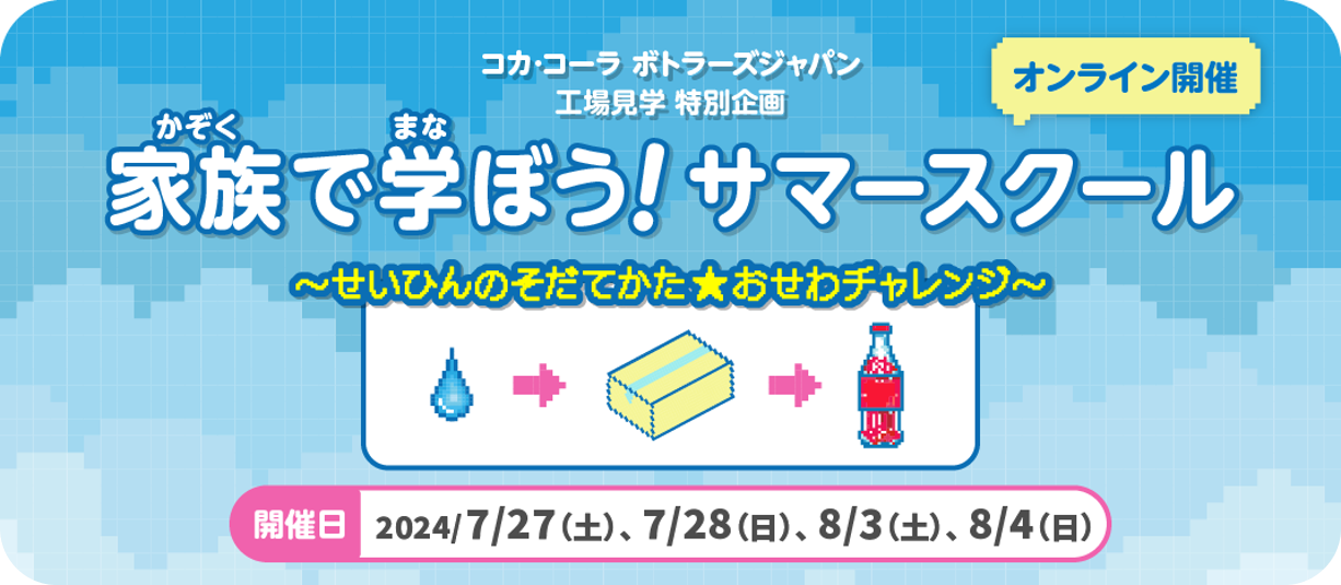 「家族で学ぼう!サマースクール」は、夏休み期間中に開催し、ご家族のみなさまで楽しみながら学んでいただくことを目的とした工場見学特別企画です。通常の工場見学プログラムにはない内容を提供します。本年のサマースクールのテーマは、「せいひんのそだてかた☆おせわチャレンジ」。森で育まれた水がPETボトル製品となり、お客さまのもとに届き、その後リサイクルされるまでの過程を、約60分の育成シミュレーション風のストーリーでご紹介します。製品の原材料である「水」がリサイクルされるまでの様子を、参加者のみなさまが温かく見守り・育てるような感覚で学べる内容としました。また、「水」を育む森を守る活動や、製造、物流、営業活動の様子などもご紹介します。さらに、正しい水分補給の方法など、生活に役立つ情報もクイズ形式で楽しく学ぶことができます。クイズの正解者の中から抽選で20名様にコカ・コーラ社製品1ケース、80名様にオリジナルグッズのプレゼントも実施します。