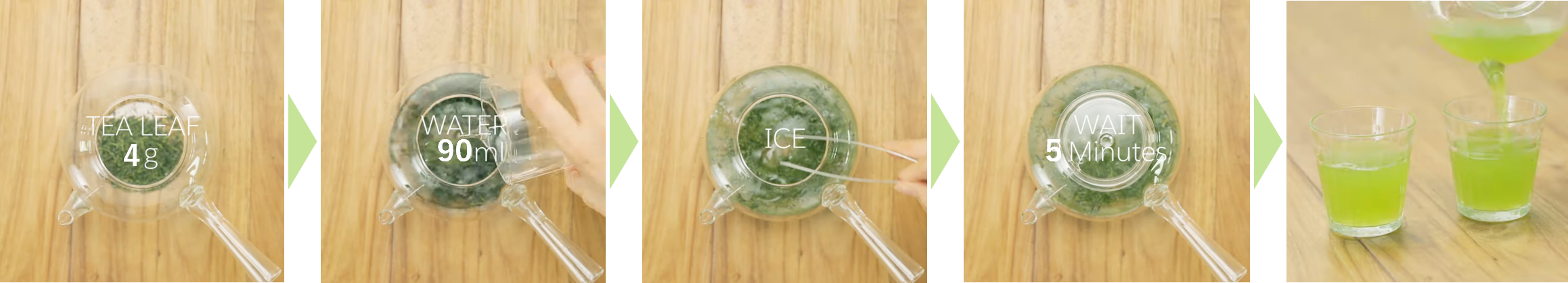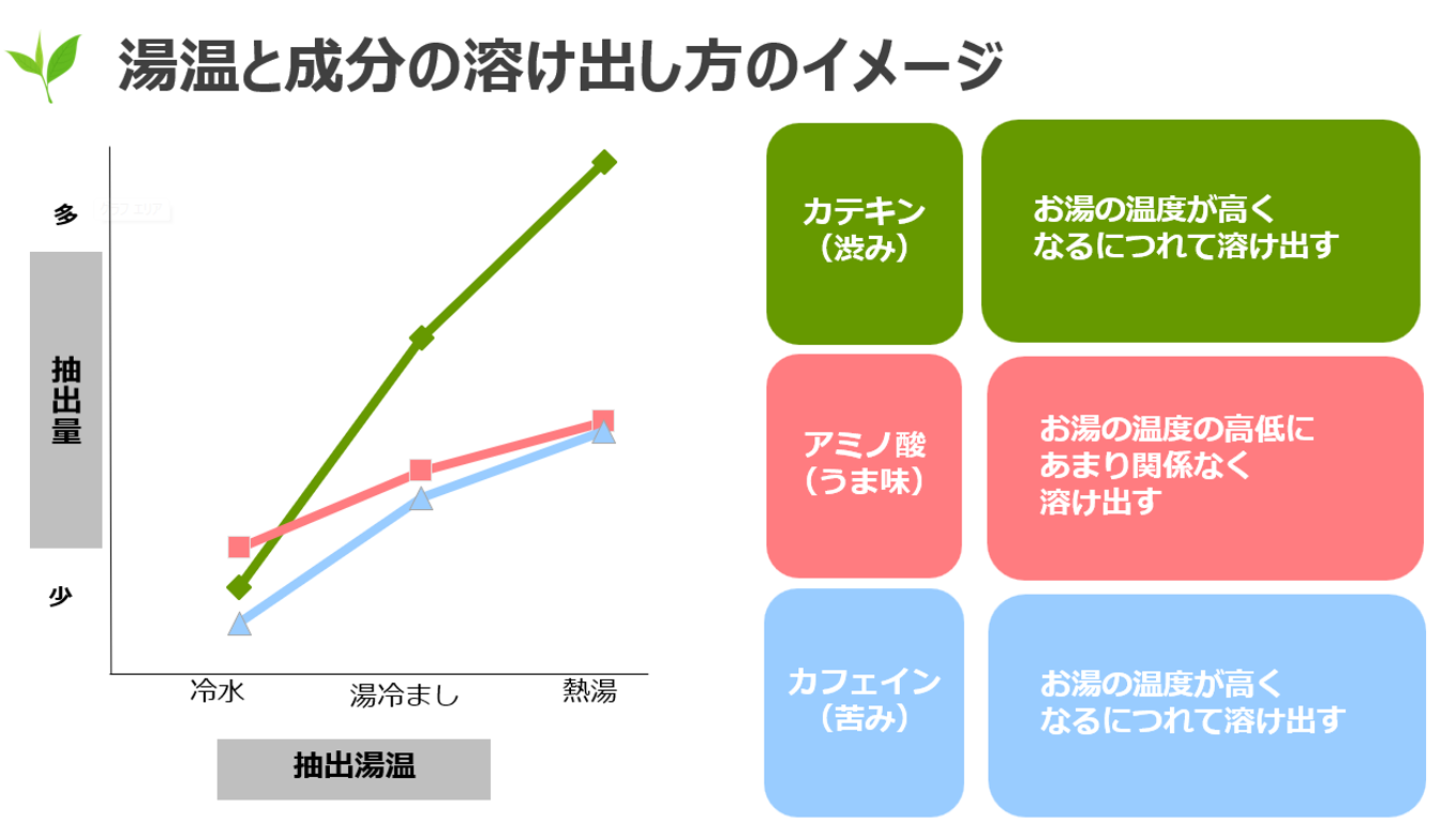 お茶はお湯の温度で味わい(=抽出成分の量)が変わります。渋み成分の「カテキン」は、高い温度でいれると抽出されやすく、低い温度でいれると抽出されにくいという特徴があります。苦み成分の「カフェイン」も「カテキン」と同じく、高温だと抽出されやすく低温だと抽出されにくいです。一方、うま味成分の「アミノ酸」は低温でも抽出されやすいため、緑茶を低温のお水で抽出するとうま味(=アミノ酸)を優位に感じる緑茶になります。また、お茶に含まれるアミノ酸の半分以上が「テアニン」のため、味わいだけでなく、テアニンの効果を得るためにも氷水出し緑茶は有効です。