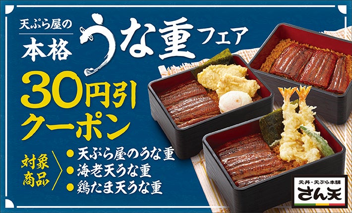 「天丼・天ぷら本舗 さん天」公式アプリでは、販売期間中に使える「天ぷら屋の本格うなぎフェア 30円引きクーポン」を配信いたします。会員の方限定でご利用いただけ、土用の丑の日のご予約でもご利用いただけるクーポンですので、この機会にぜひ「天丼・天ぷら本舗 さん天」公式アプリをダウンロード&会員登録ください。
