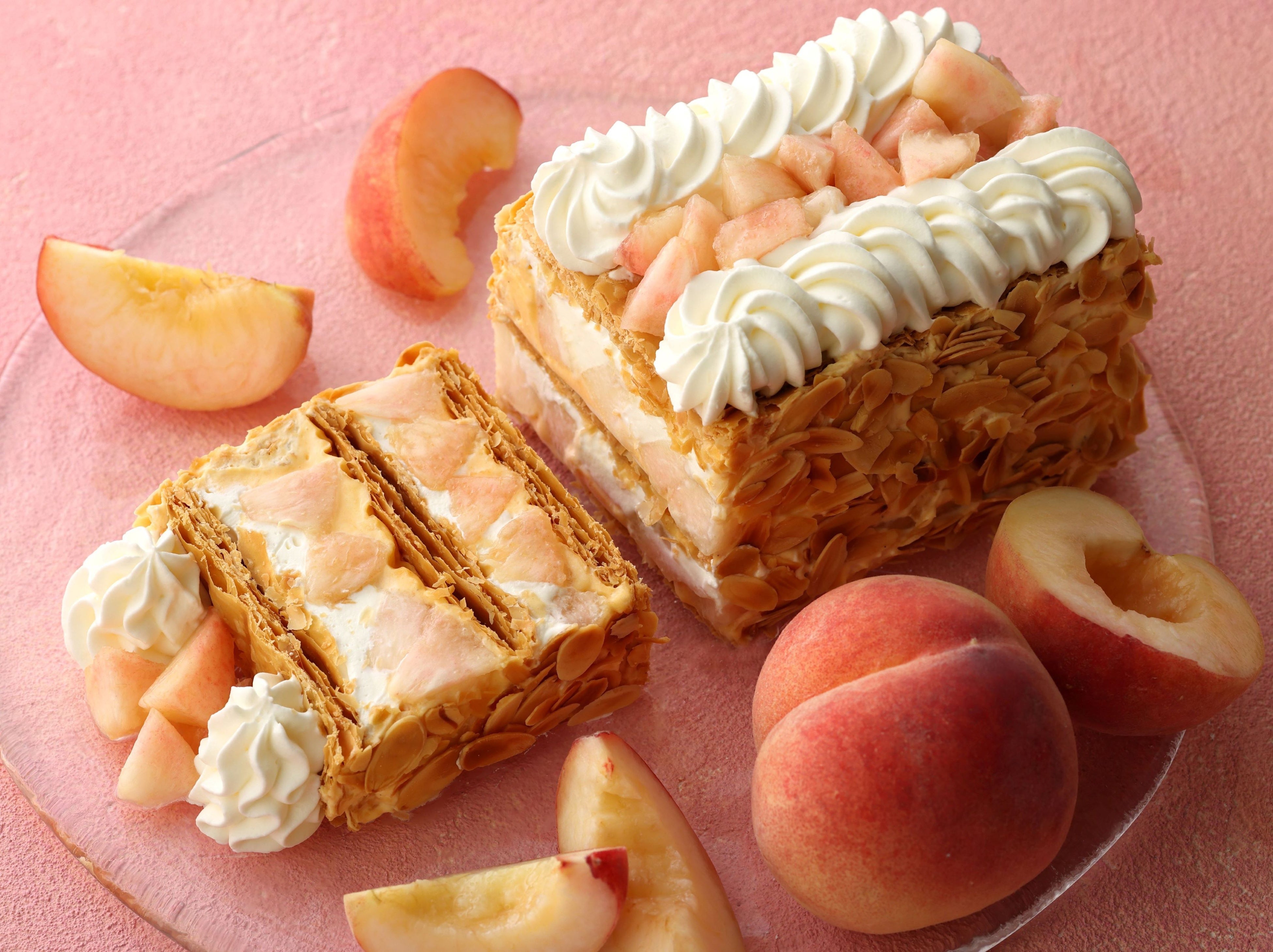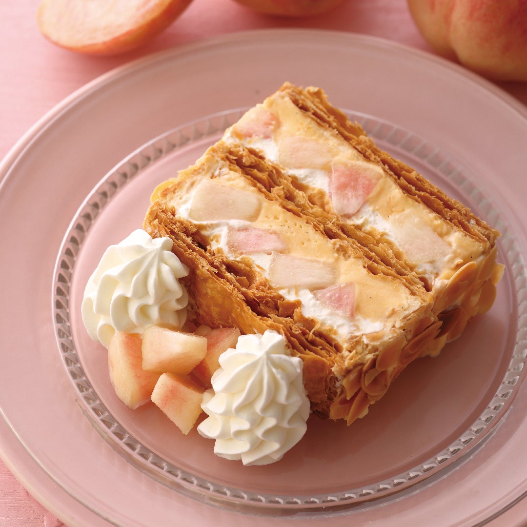 ジューシーな白桃とサクサクのパイ、なめらかなクリームが織りなす夏限定のハーモニーをお楽しみください。