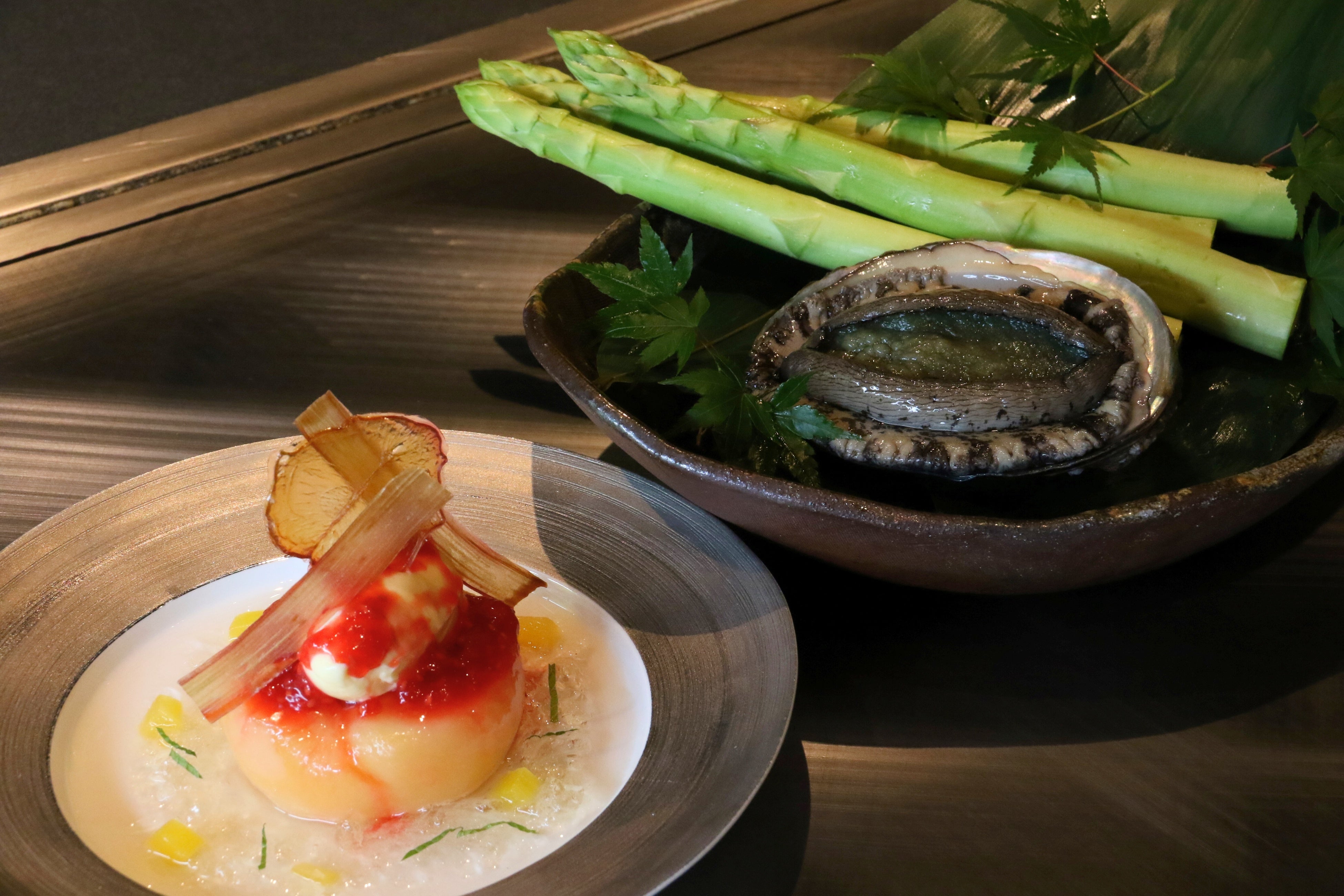 ・黒鮑と夏採れアスパラガス 小田原産梅と大葉の餡