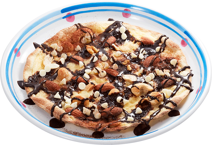 カスタードクリームを塗ったピッツァに、生チョコソース、ホワイトチョコチップをトッピングしました。ダブルチョコの濃厚な味わいに、ミックスナッツの香ばしさや食感がアクセントを加えます。