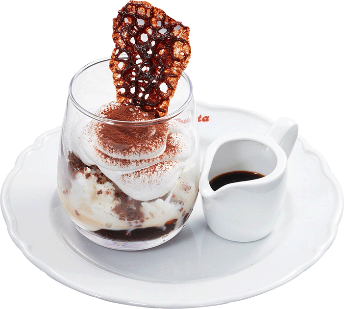 コーヒーゼリーとミルクグラニータ、チョコクランチ、ふんわりホイップをあわせ、ティラミス風に仕上げた一品です。ぷるぷるのコーヒーゼリー、シャリシャリのグラニータ、サクサクのチョコクランチ、クリーミーなふんわりホイップのマリアージュをお楽しみください。別添えの冷たいエスプレッソを加えると、よりすっきりとした、大人の味わいへの変化をご堪能いただけます。