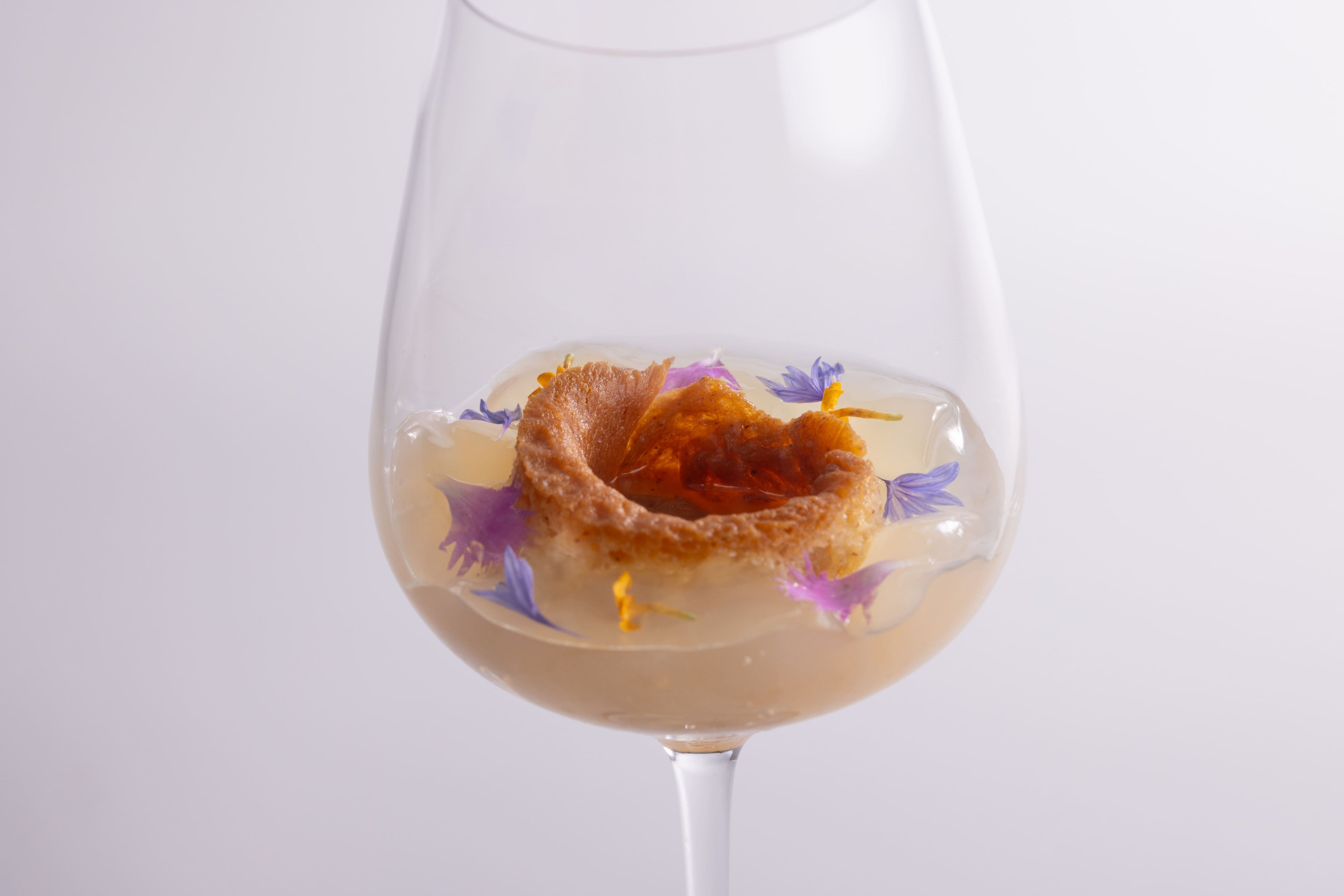サヴァランにレモンマリーゴールドやカカオパルプを使ったジュレやクリームを重ね