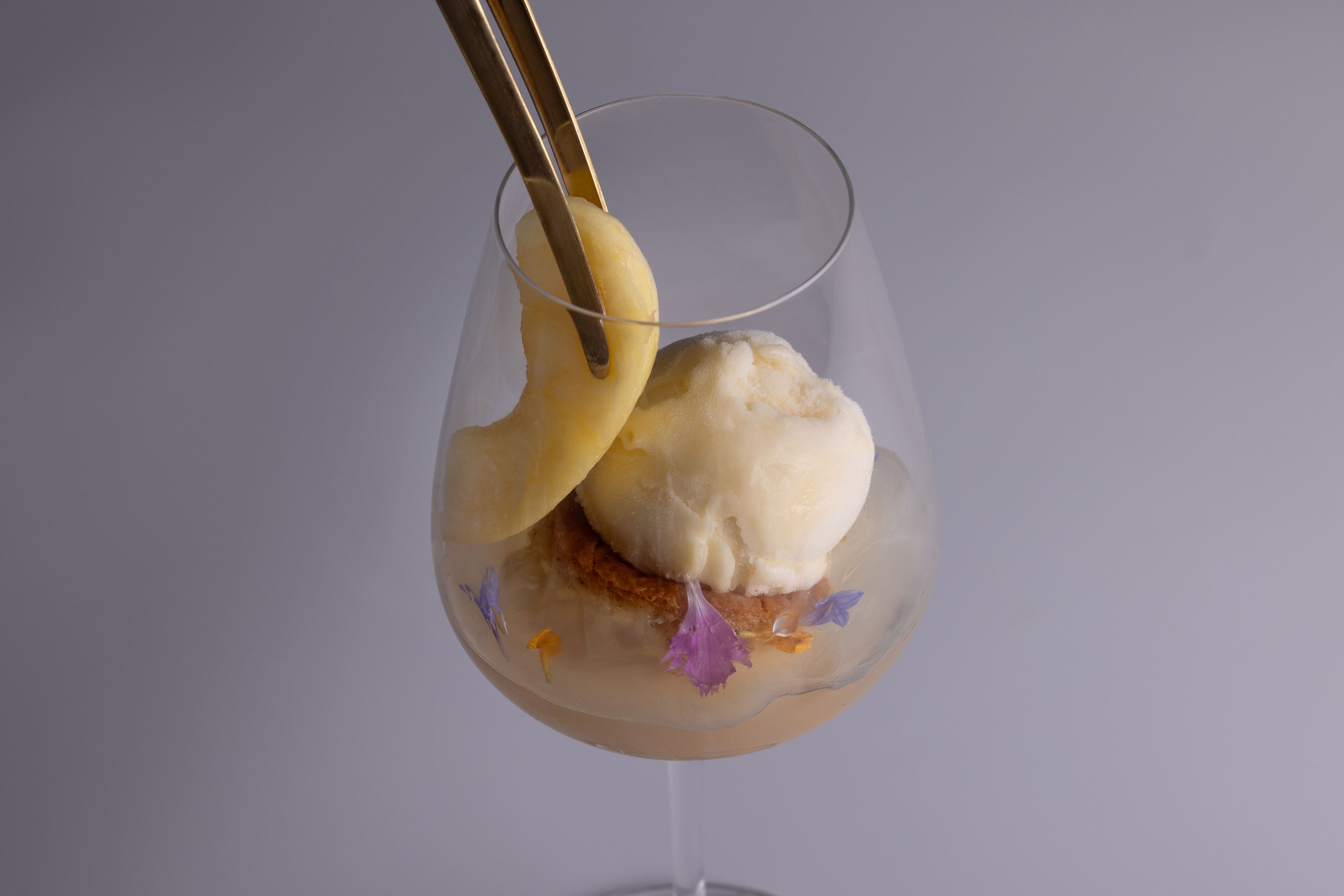 桃のフレッシュな甘みとアイスのミルキーさが、柑橘が香るサヴァランの清涼感を
