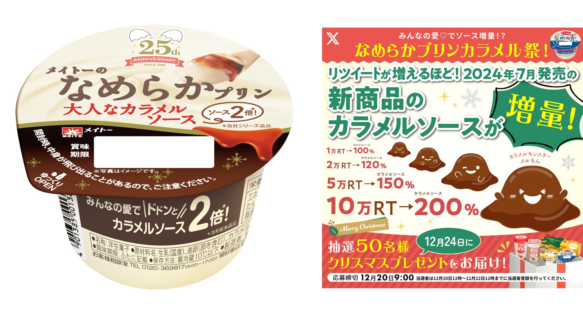「なめらかプリンカラメル祭!」は、今年発売25周年を迎える「メイトーのなめらかプリン」の周年企画のひとつとして、2023年12月にX(旧Twitter)で実施しました。リポスト数に応じて新商品のカラメルソースの量が変化し、最大でソース量が2倍*となる消費者参加型のキャンペーンです。なめプリファンの皆様から、「結果が気になる!」「楽しみ!」というコメントとともにたくさんの応援をいただき、ついに10万リポストを達成したため、カラメルソース量2倍*の本商品の発売が決定いたしました。
