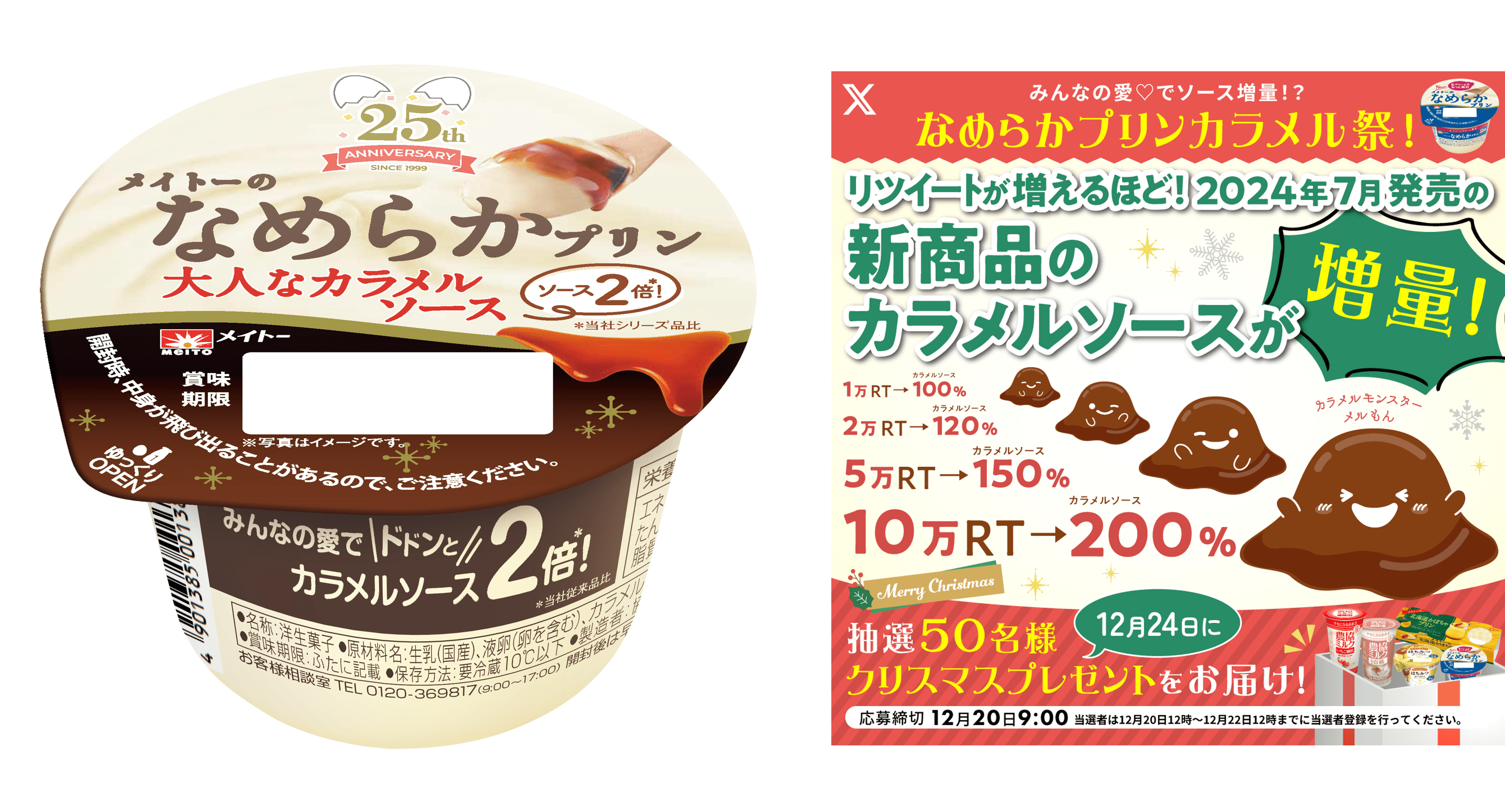 「なめらかプリンカラメル祭!」は、今年発売25周年を迎える「メイトーのなめらかプリン」の周年企画のひとつとして、2023年12月にX(旧Twitter)で実施しました。リポスト数に応じて新商品のカラメルソースの量が変化し、最大でソース量が2倍*となる消費者参加型のキャンペーンです。なめプリファンの皆様から、「結果が気になる!」「楽しみ!」というコメントとともにたくさんの応援をいただき、ついに10万リポストを達成したため、カラメルソース量2倍*の本商品の発売が決定いたしました。