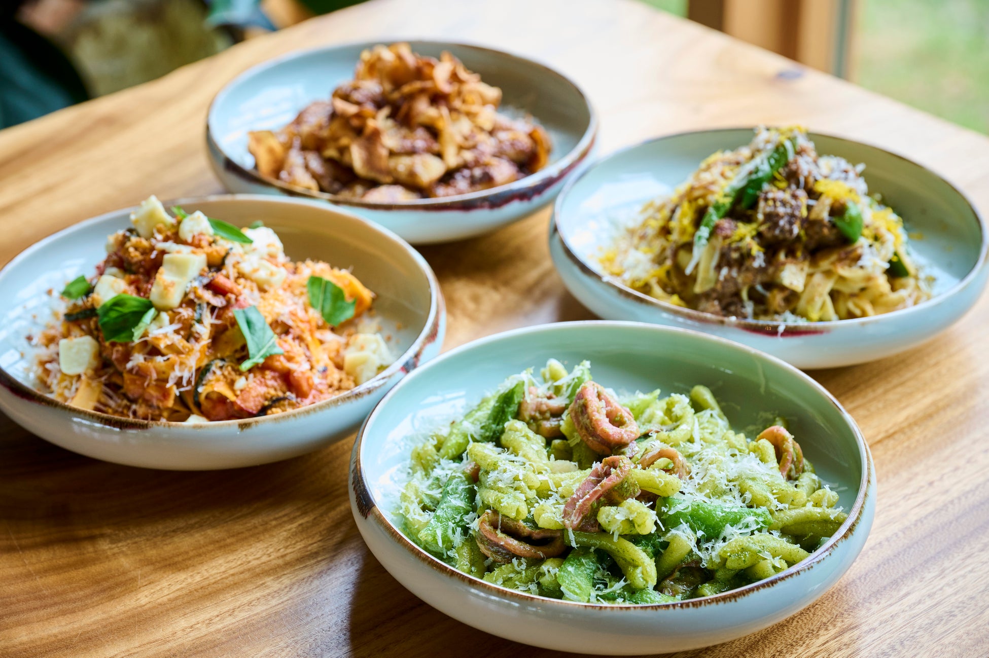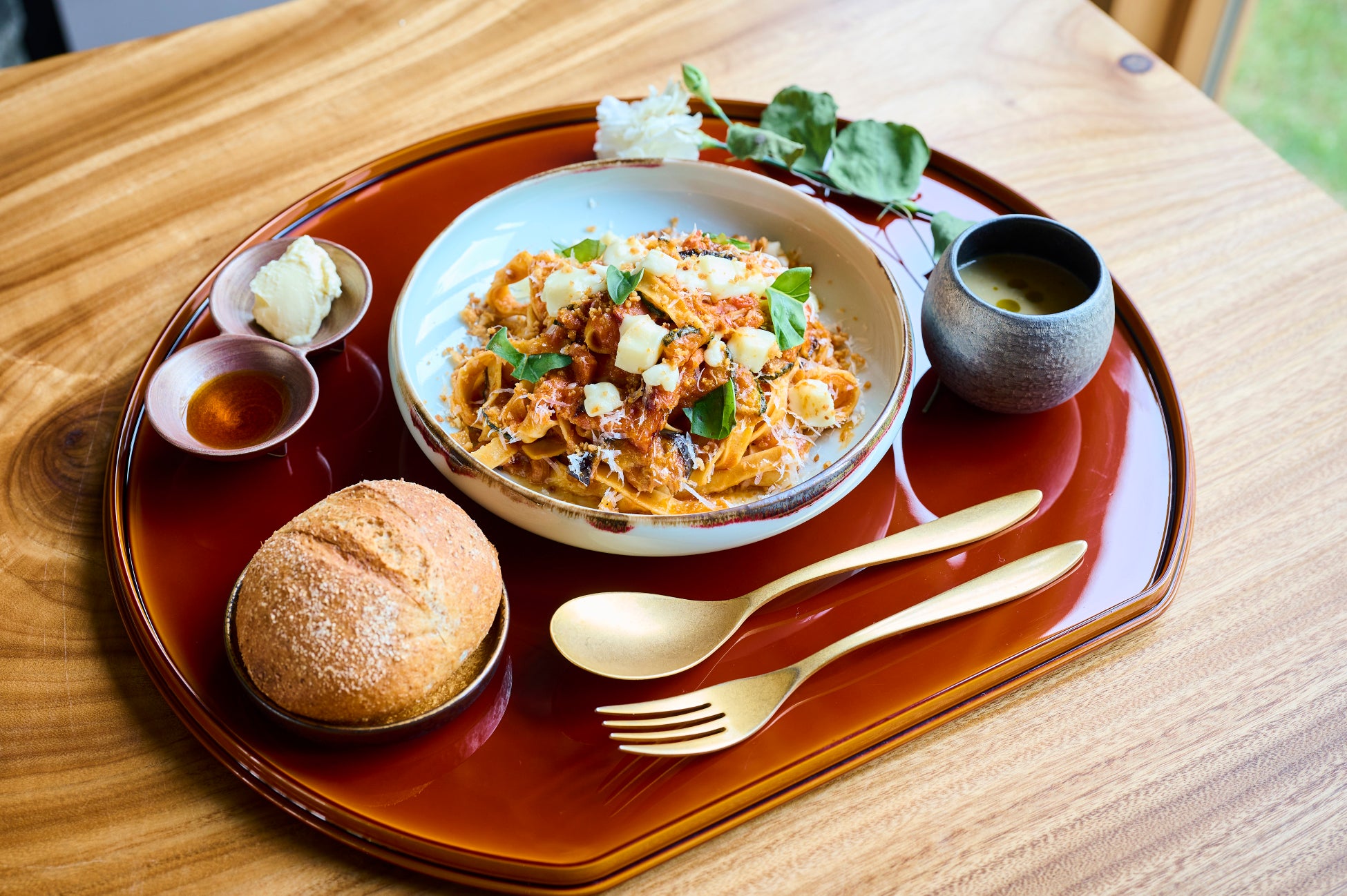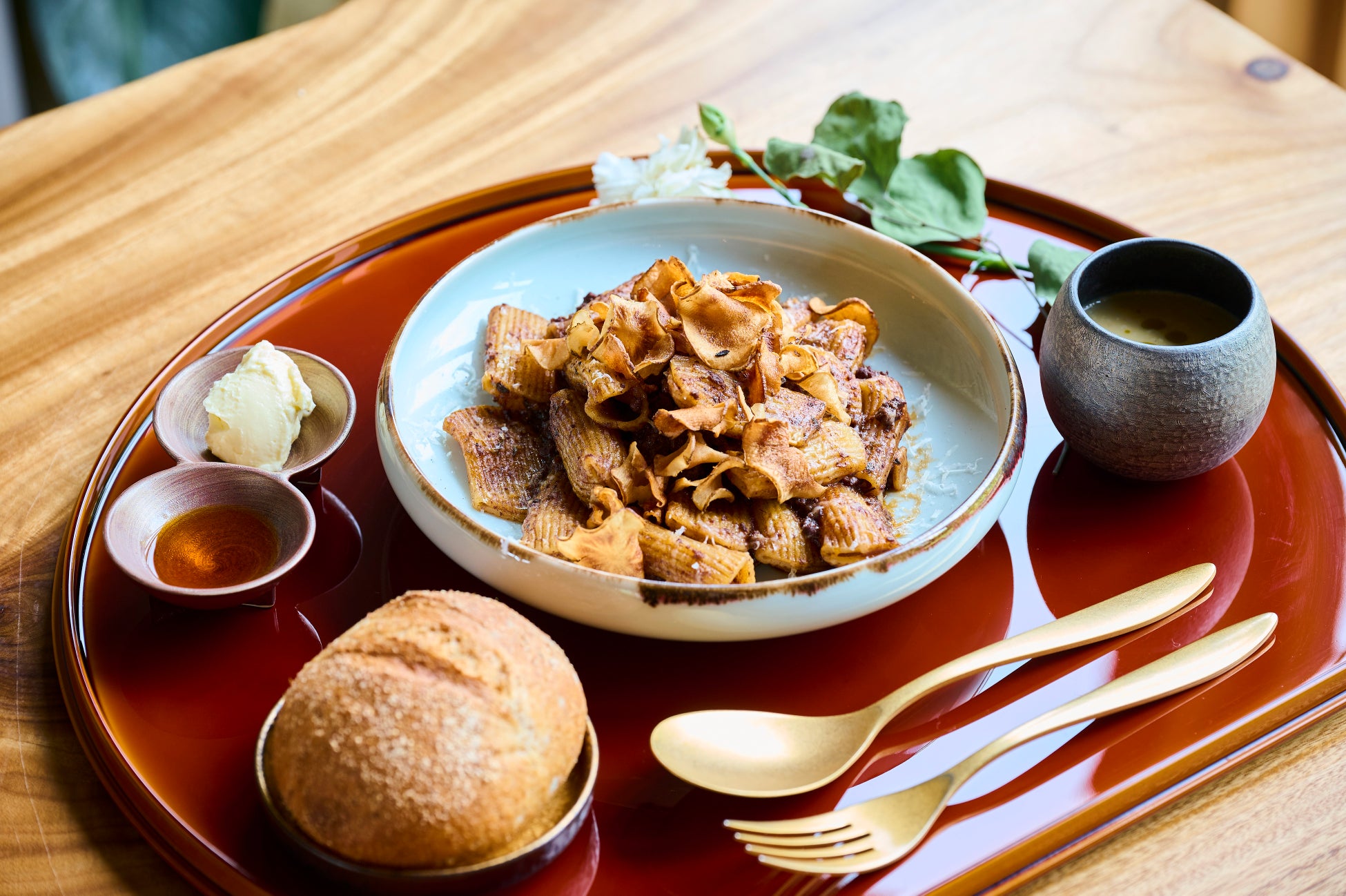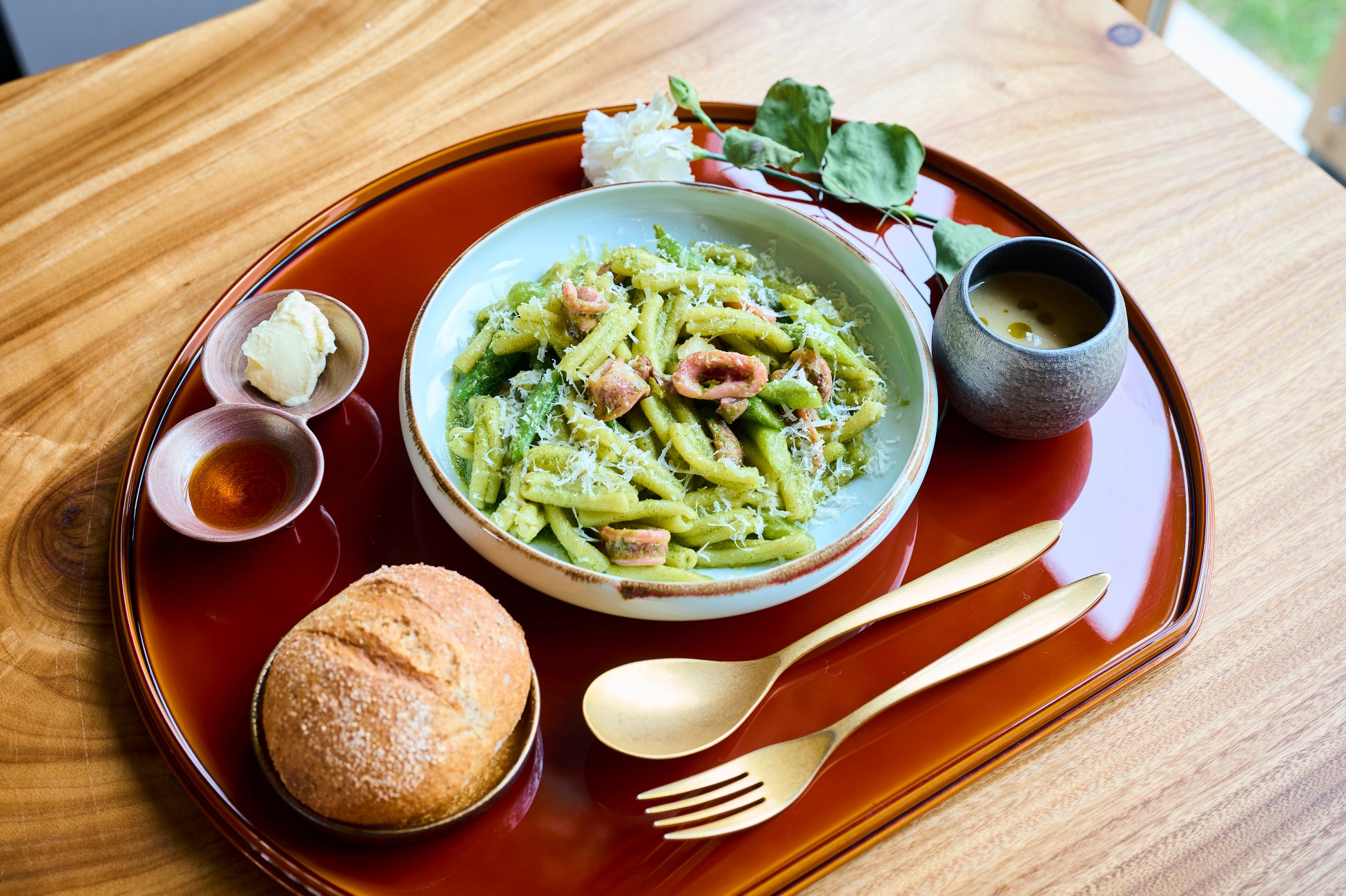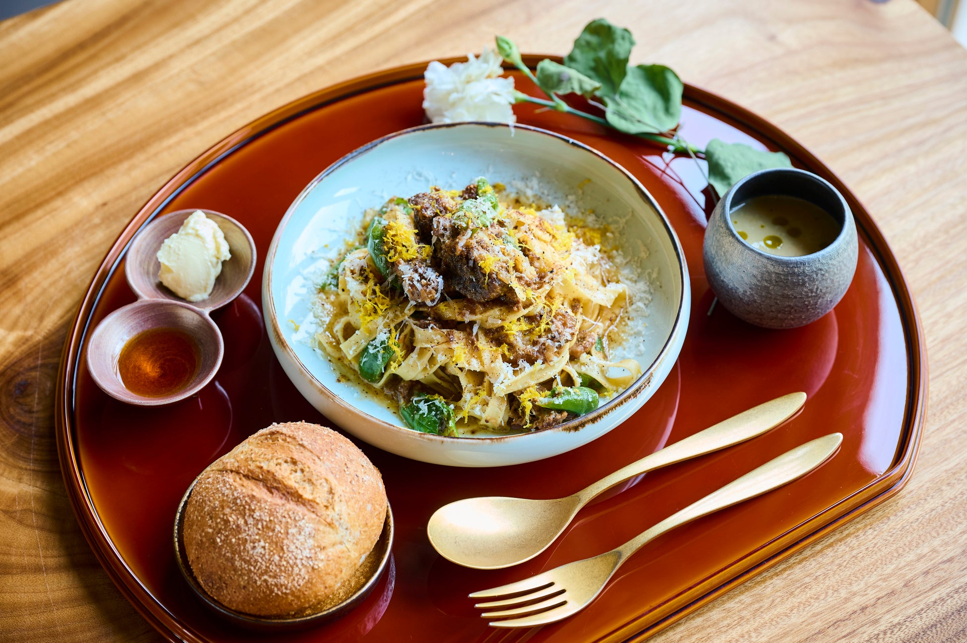ワイキキのフレンチレストラン「natuRe waikiki」の新業態「natuRe tokyo」は、2024年4月に都立明治公園内にオープンしたユーズフルダイニング。レストランの繊細さとビストロの気軽さを併せ持つサステナブル思考の一軒家レストランです。オープンからスタートしたランチを一部リニューアルし、経産牛や不揃いの野菜、薪焼きのベーコンを使ったパスタランチをスタートします。ディナーの定番メニューであるヤリイカとアスパラガスのカサレッチェの他、週替わりでお楽しみいただけるパスタが3種類登場します。パスタとセットになっている全粒粉のパンには自家製のリコッタチーズを作る際に余るホエーを使用した酒粕バターを添えてご提供いたします。