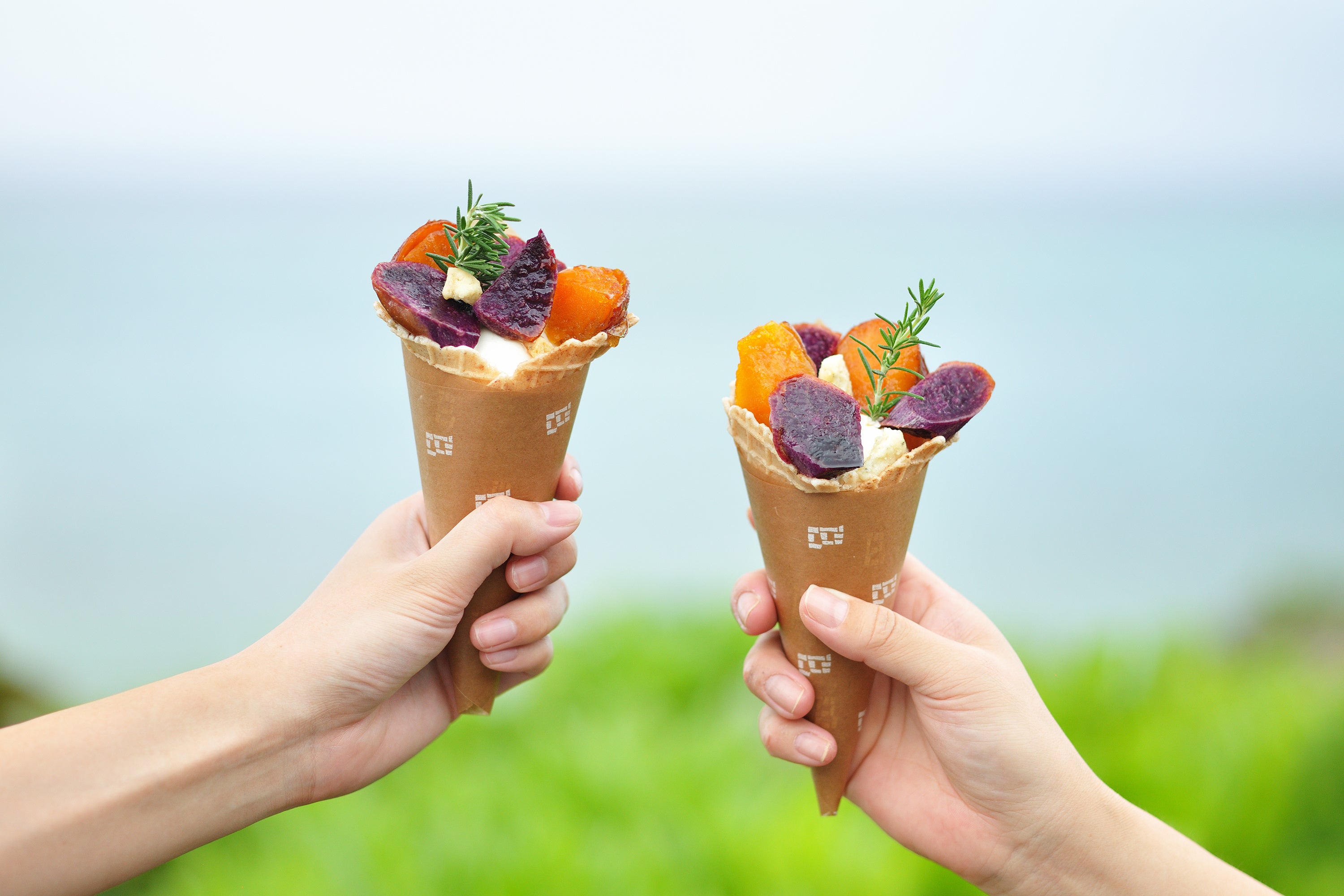 素揚げしたひとくちサイズの紅芋と黄金芋(くがにいも)に、黒糖ソースに絡めて大学芋にしました。ミルクのジェラートを一緒に盛り付けて、パフェのように楽しむ温かくて冷たいスイーツです。ほくほくとした芋に、とろけたジェラートが黒糖の旨味を引き立てます。ジェラートコーンに盛り付けるパフェはテーブル席はもちろんのこと、白砂のビーチや岩陰など好きな場所で気軽に味わいます。