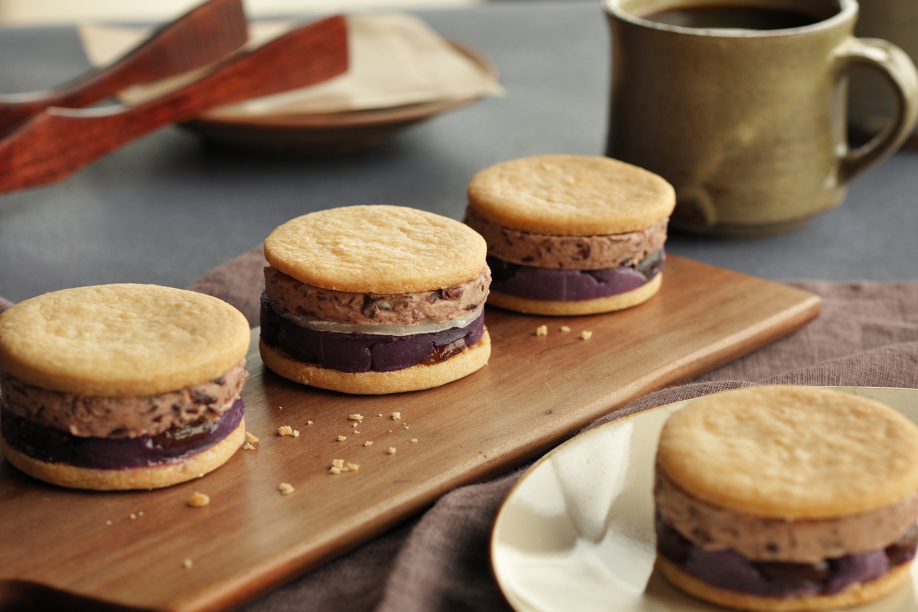沖縄土産で親しまれているお菓子「ちんすこう」を薄焼きのサブレにして、オリジナルの紅芋餡をサンドしました。優しい甘みとほっこりとした芋の風味に、小豆のあんことチーズクリームを組み合わせています。 中には沖縄の「ぜんざい」をイメージした金時豆と求肥もサンドして、1つのスイーツで「紅芋」「ちんすこう」「ぜんざい」、沖縄を代表する3つのスイーツが楽しめます。
