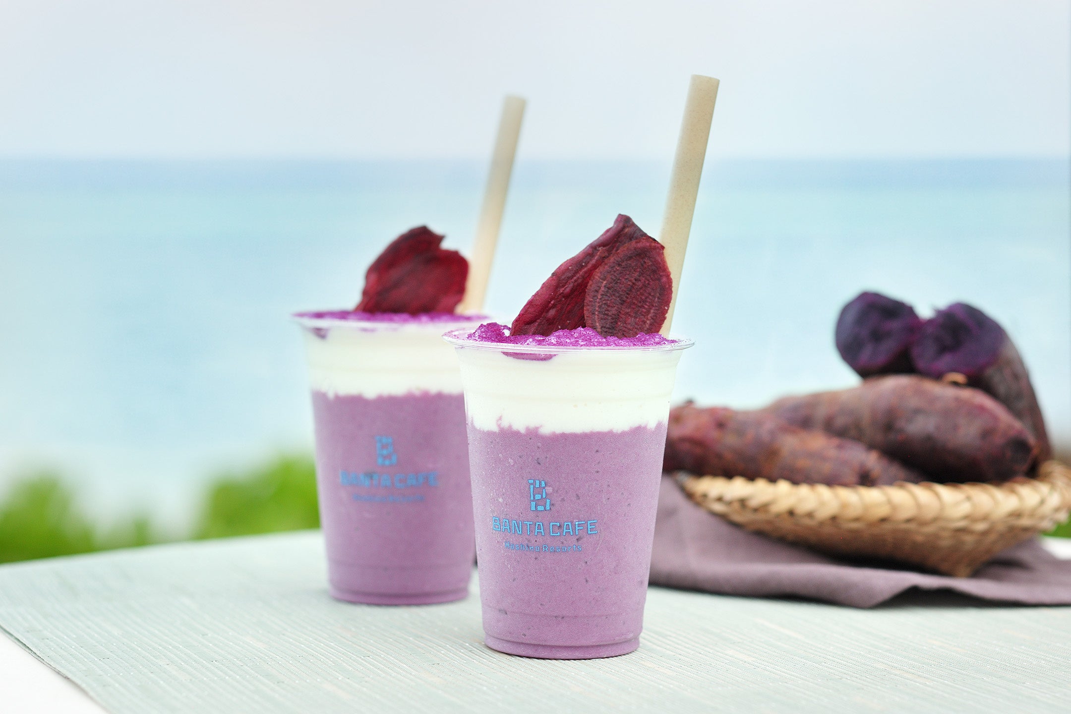 バンタカフェのある沖縄県読谷村は、県内一の紅イモの産地です。水はけのよい沖縄の土壌に適した農作物ですが、生イモでは県外への持ち出しが禁止されています。ホクホクとした芋の食感や風味、産地だからこそ味わえる美味しさを体験して欲しいと思い、特産の紅イモを使ったメニューを揃えました。