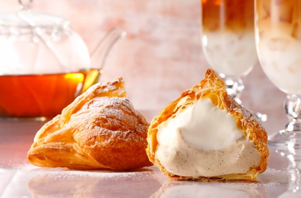 オーブンで焼き上げたサックサクのパイに2つのクリームを入れた期間限定のミルクパイです。紅茶クリームはアールグレイ香る、華やかな紅茶の味わい、ミルククリームは北海道でつくられた生クリームとマスカルポーネチーズ、練乳で仕立てたまろやかな味わいです。2つのクリームが奏でる絶妙なマリアージュを是非ご賞味ください。