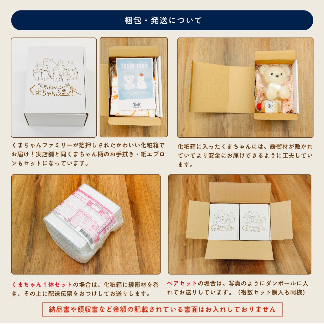 くまちゃんファミリーが箔押しされたかわいい化粧箱入りなので、ギフトにもぴったり。外食店舗でご提供している、くまちゃん柄のお手拭き・紙エプロンもついており、楽しい食卓を演出できます。