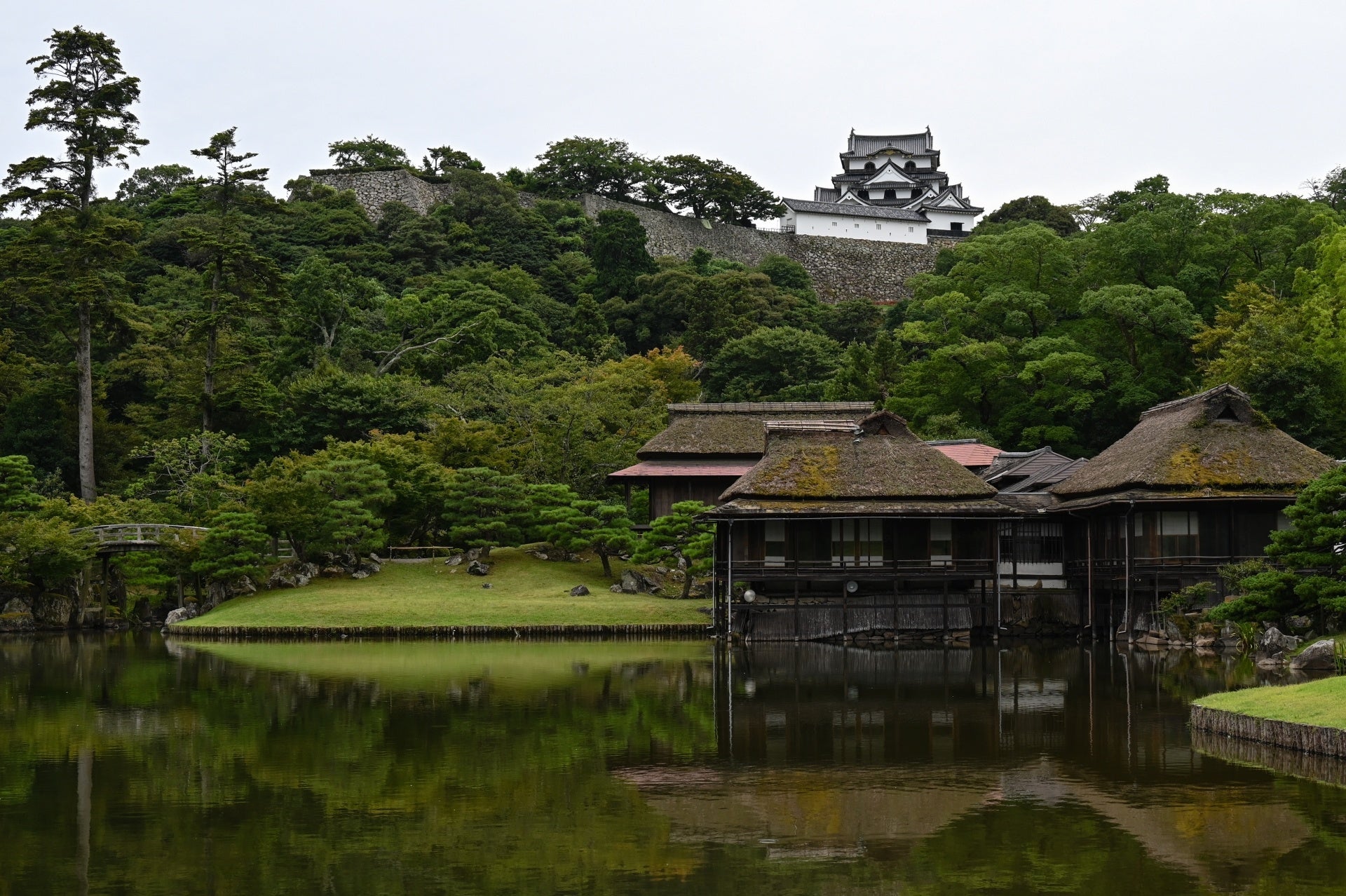①彦根城内の玄宮園を専門ガイドの案内で散策。